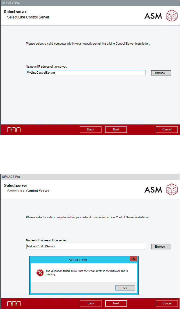 SIPLACE Pro 15.1 (R18 - 1) / Installat ion Manual 05/2018 Edition 25 The Select Serv er dialog is displ ayed. Figure 6-19: Selecting Li ne Control Server ► Enter the serv er name of the remote co mputer on which the Li n…