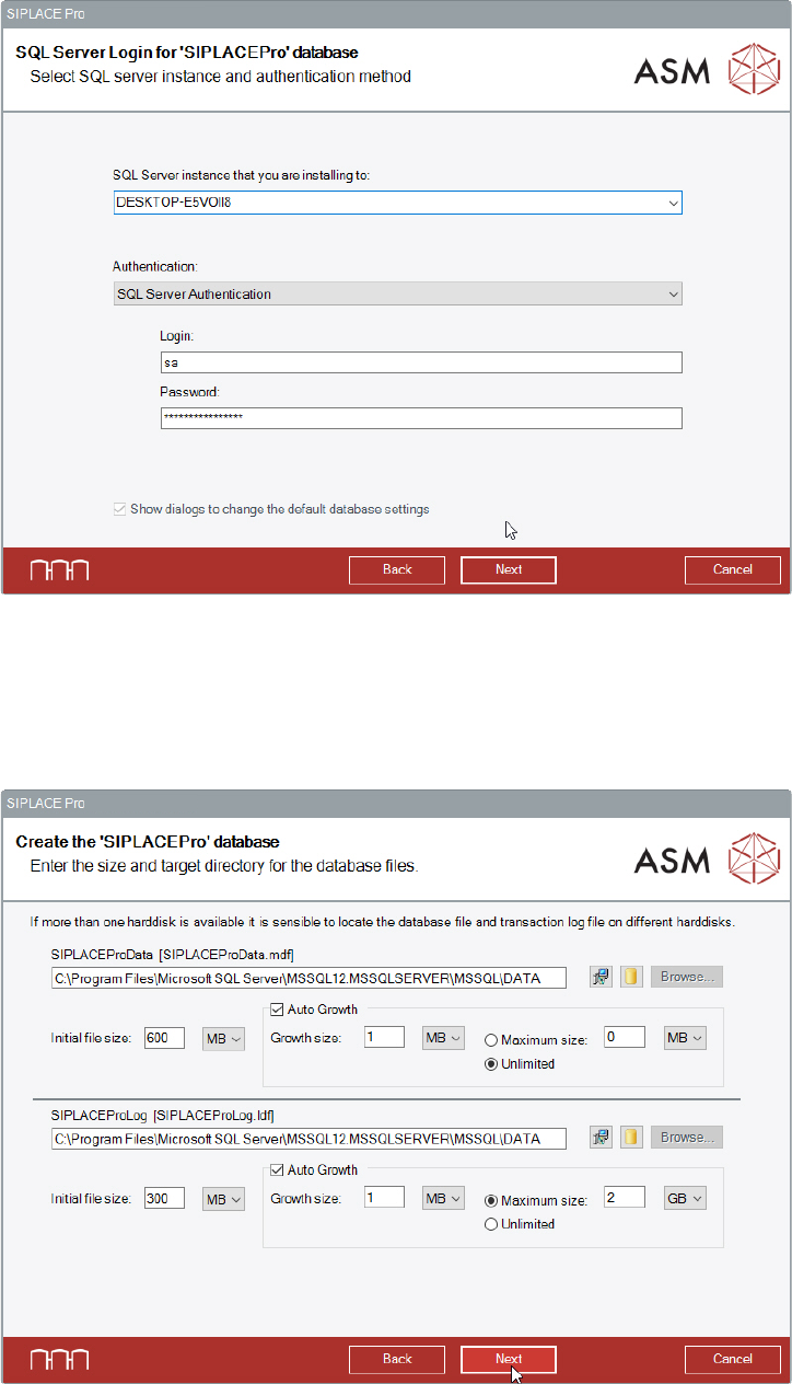 SIPLACE Pro 15.1 (R18 - 1) / Installat ion Manual 05/2018 Edition 38 NOTICE The paths to the remot e database are on ly checked for corre ct spelling! It will not be check ed if : – t he defined driv e exists – t he defi…