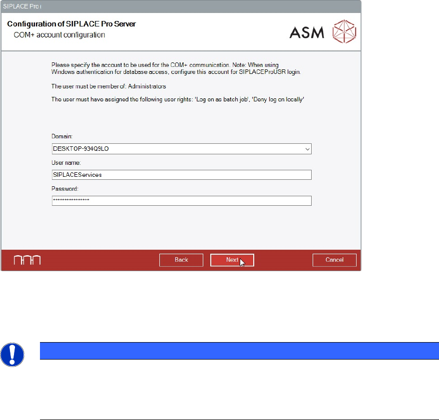 SIPLACE Pro 15.1 (R18 - 1) / Installat ion Manual 05/2018 Edition 54 Figure 8-4: Enabling / dis abling SIPLACE Pro access rights ► If applicable, enabl e or disable the S IPLACE Pro acces s rights . ► Click the Next butt…