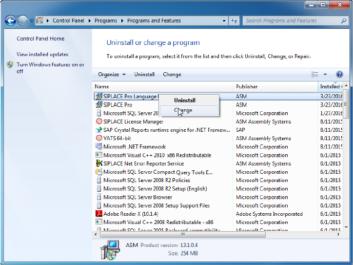 ► Click with the right mouse key on the SIPLACE Pro Language Pack entry in the list of installed