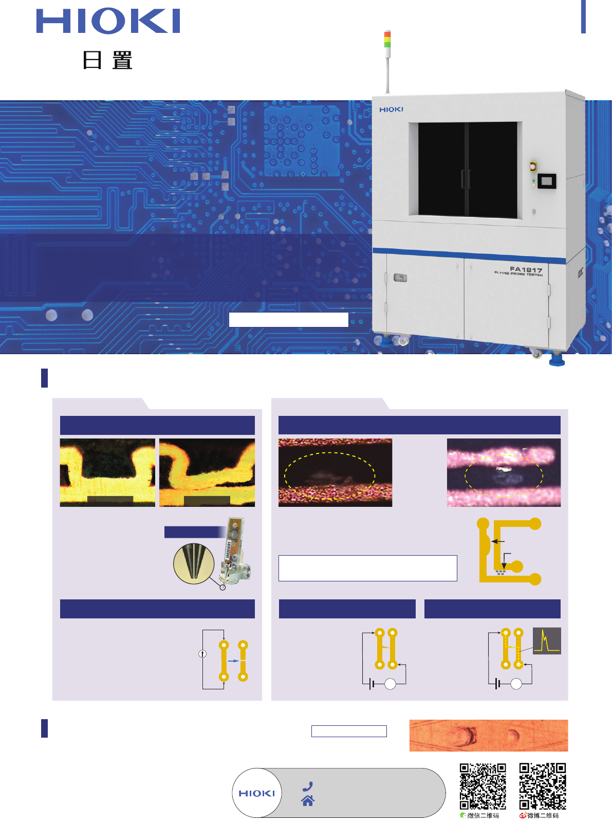 高速飞针测试机 FA1817 FLYING PROBE TESTER 最新机型 功能介绍 专 用测试针 通过瞬间施加高电 (Max. 200 mA) 进行测 试 ,检出 线 路 上似 断非 断 的 不良 状 态 。 施加 1 V 的低压 信 号 , 在不破坏 极 细的短 路状 态 下 检出 不良 。 检出 电弧 放电 在绝缘 测试时检 出线 路间 的绝 缘 状 态 劣化处 所产 生的电 弧 放电 。 ▶ ▶ 使 用 4 线 式 低 阻 …