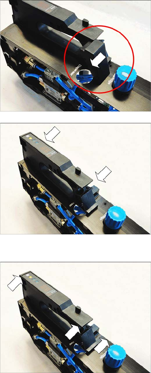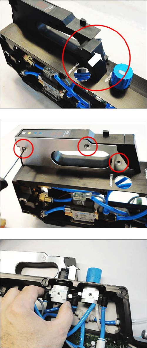 Ersatzteiletausch Griff komplett 3.24.2 Griff komplett montieren 90 Serviceanleitung SIPLACE Glue Feeder ► Schieben Sie die Griffverkleidu ng wie abgebildet seit - lich in den Griff des Glue F eeders. ► Befestigen Sie da…