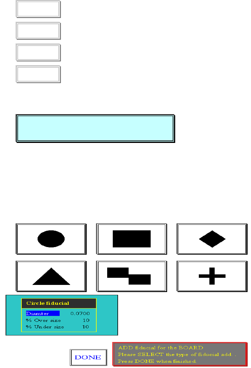 ADD fidu cial for the BOARD ( 增加 Mar k 點 到 PCB 上 ) Please SELE CT the type of fidu cial ad d. ( 請 選擇 Mark 點 型 式 ) Pr ess DONE wh en f inished. ( 按 DONE 完成 ) 按 NEXT 之後 , 出 現 下列視 窗: Move the tra ckball pointer to the a r e…