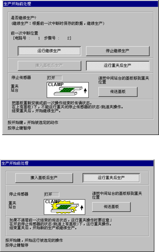 不管是否有继续生产文件,都将显示基板搬入后是进行生产还是进行再夹紧。