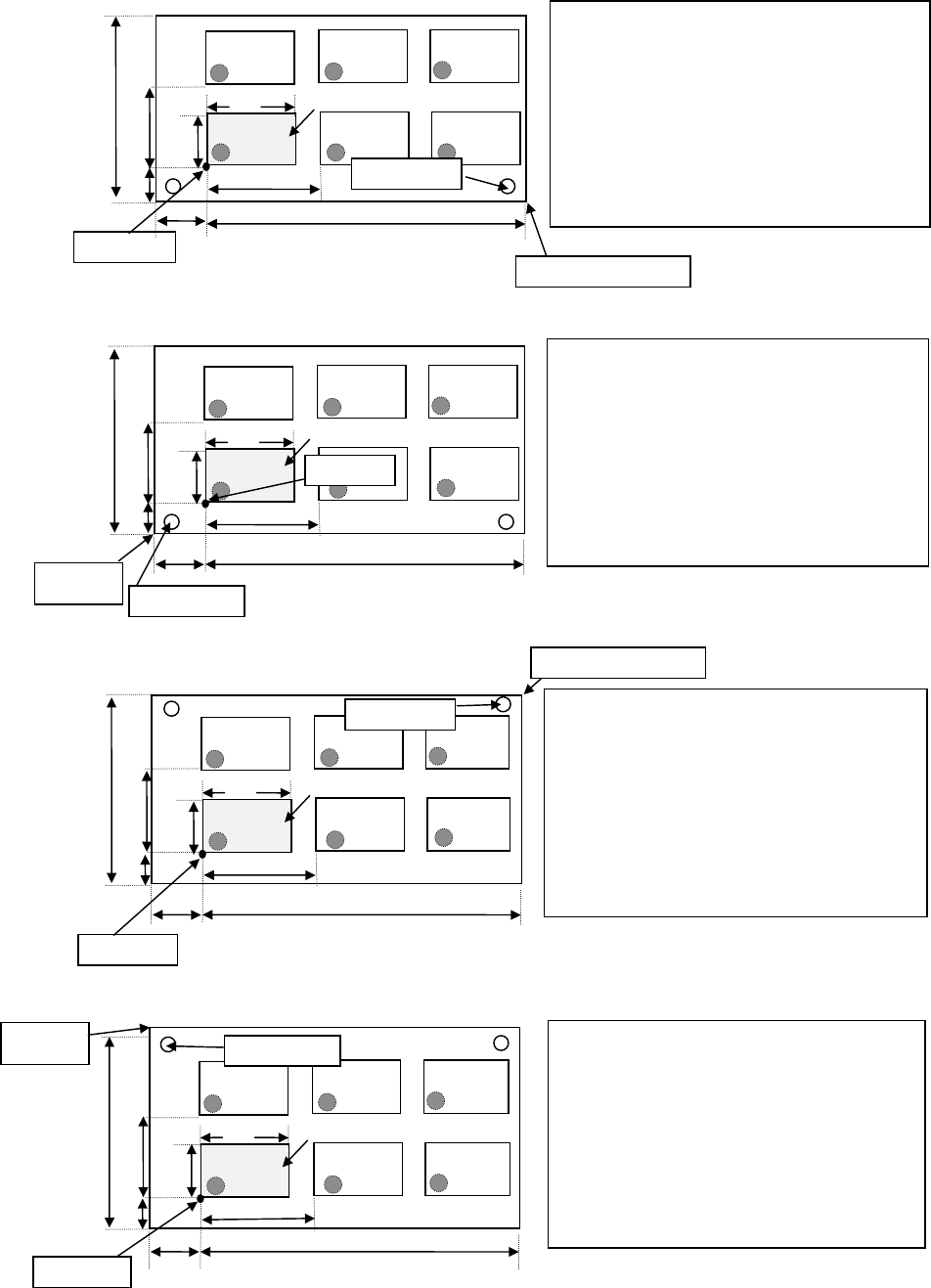 第4章 生产程序制作 Rev01 4-20 例 1) 非矩阵电路板的数据输入例 以左下方的电路为基准电路,以电路的左下方的角为电路原点时 ① 前面基准、L→R 时(外形基准时) ② 前面基准、L→R 时(外形基准时) ③ 后面基准、L→R 时(外形基准时) ④ 后面基准、R→L 时(外形基准时) 基板外形尺寸 X=200 Y=120 定位孔位置 X=0 Y=0 基板设计偏移量 X=5 Y=-5 电路外形尺寸 X=50 Y=30 电路设计…