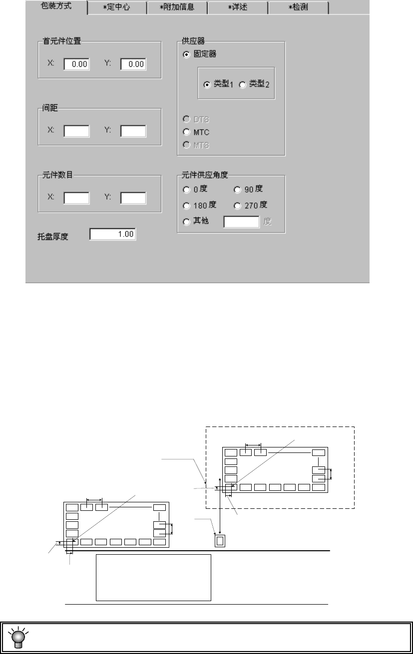 用从托盘外形开始的距离输入盘元件前头元件的中心位置(X、Y)。