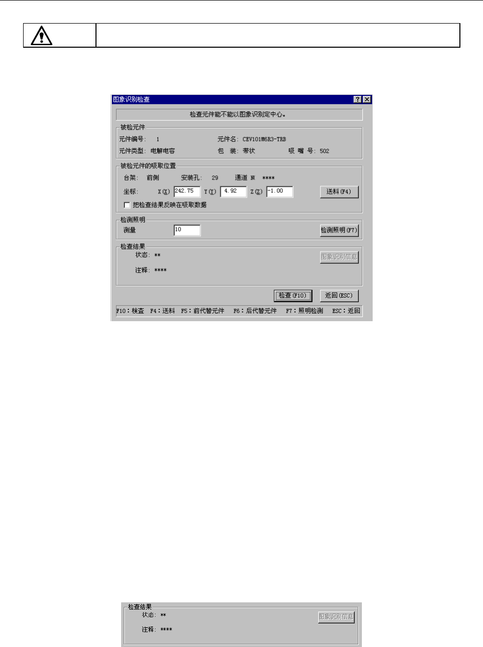 第4章 生产程序制作 Rev01 4-128 4-5-4-3 检查 进行实际元件的贴片头安装,检查能否用图像识别进行元件定心。 注意 为了避免人身伤害,在机器运行过程中,切勿将手和头伸入装置内部。 4-5-4-3-1 图像识别检查 从菜单栏中选择“机器操作”/“检查”/“图像识别”,显示如下画面。 图 4-5- 32图像识别检查 (1) 需检查的元件 为了进行图像识别检查,显示必要的元件内容。 (2) 照明检测按钮 在默认的照明亮度下无…