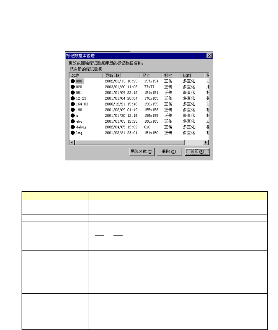 在一览表中显示数据库中储存的标记数据。各项目的含义如下。