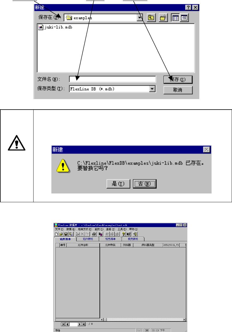第 5 章 其它功能 Rev02 5-5 ① 空白 Flexline 数据库 选择后,即显示如下图所示的新文件名输入画面。 选择保存地址 的文件夹后,输入文件名,单击“保存”。 注意 在上述 “新文件夹名输入画面” 中, 请决对不要选择原有的数据库文件。 选择原有的数据库文件, 则显示如下信息。 在此, 单击 “是 ” , 则数据库 文件的内容全部被删除。 敬请注意。 显示数据库新建画面。