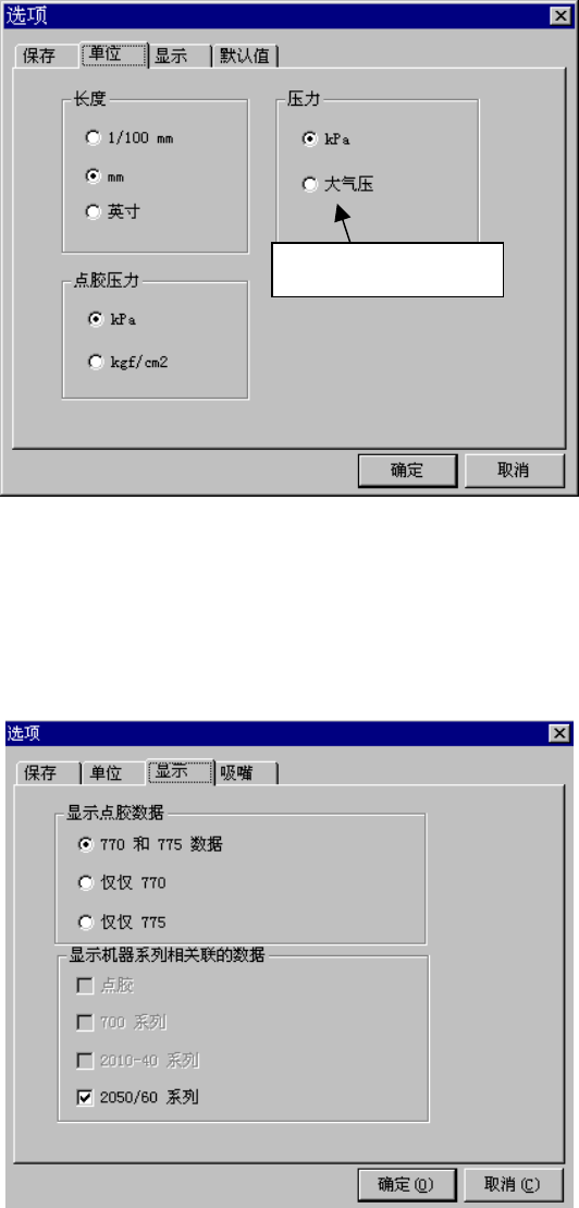 第 5 章 其它功能 Rev02 5-23 2) 单位 指定长度和压力的单位。在KE-2050/2060中没有使用“点胶压力”。 3) 显示 请确认已选中“显示机器相关的数据”中的“2050/60系列”。 其它项目在KE-2050/2060中没有使用。 “大气压” =