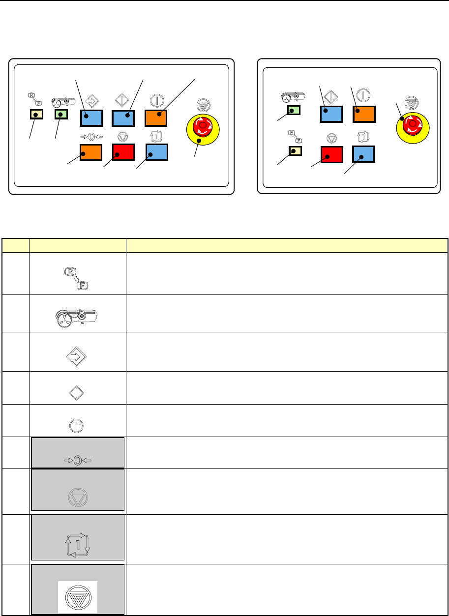 第 1 章 设备概要 Rev02 1-17 1-4-7 工作板 可通过主机的操作面板来控制机器的动作。 < 前 面 > < 后 面 > 图 1- 14 工作板外观图 表 1- 7 开关功能概要 No 开关名 功 能 1 KEYBOARD ·进行键盘操作的<FRONT>、<REAR>切换。 ·按下该开关,则指示灯点亮。 2 FEEDER ·进行送料器单元有效/无效的切换。 ·按下该开关,当指…