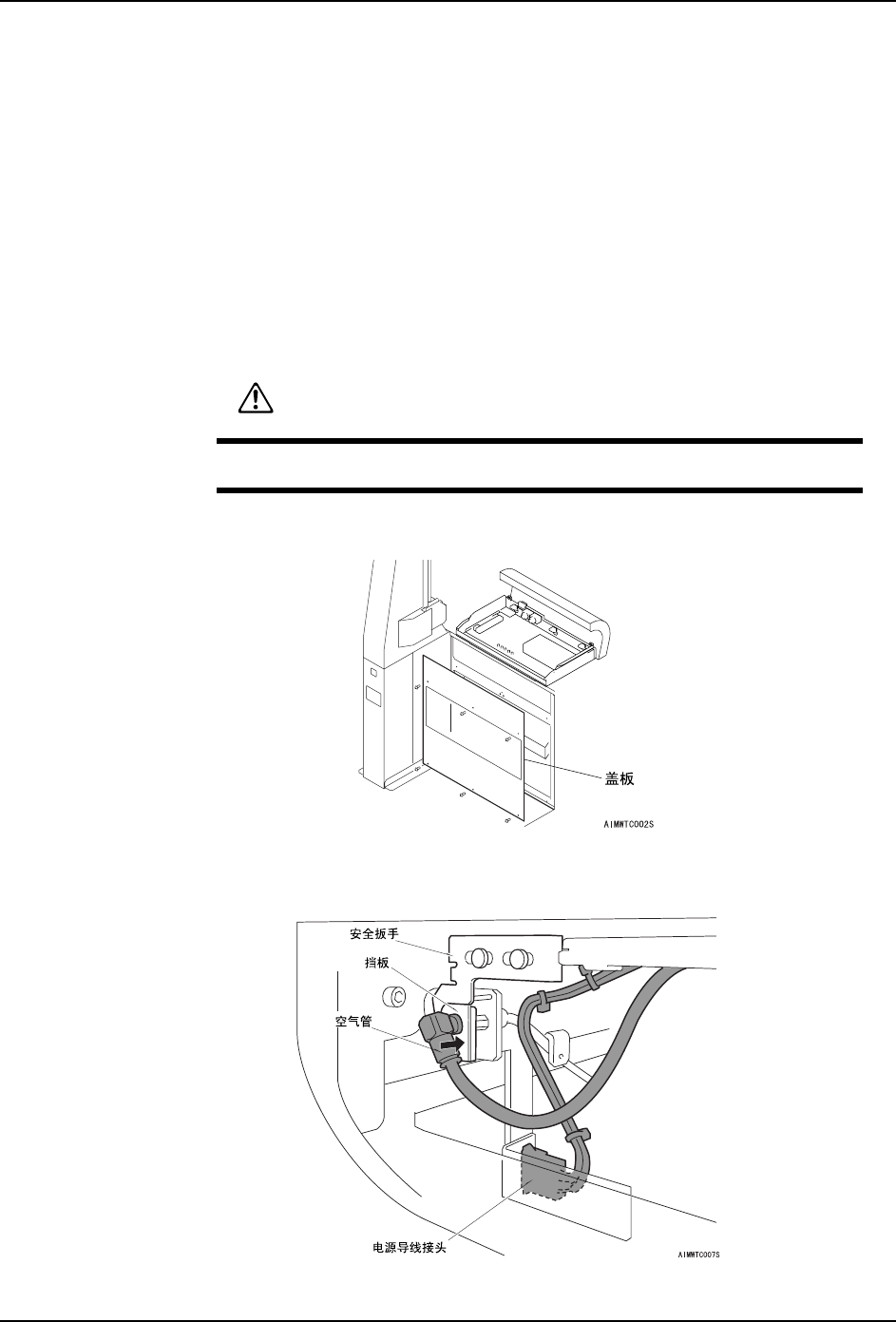 4. 在废料带处理单元正面拆除电源导线接插头。将挡板向下图箭头方向按后拆除空气管。