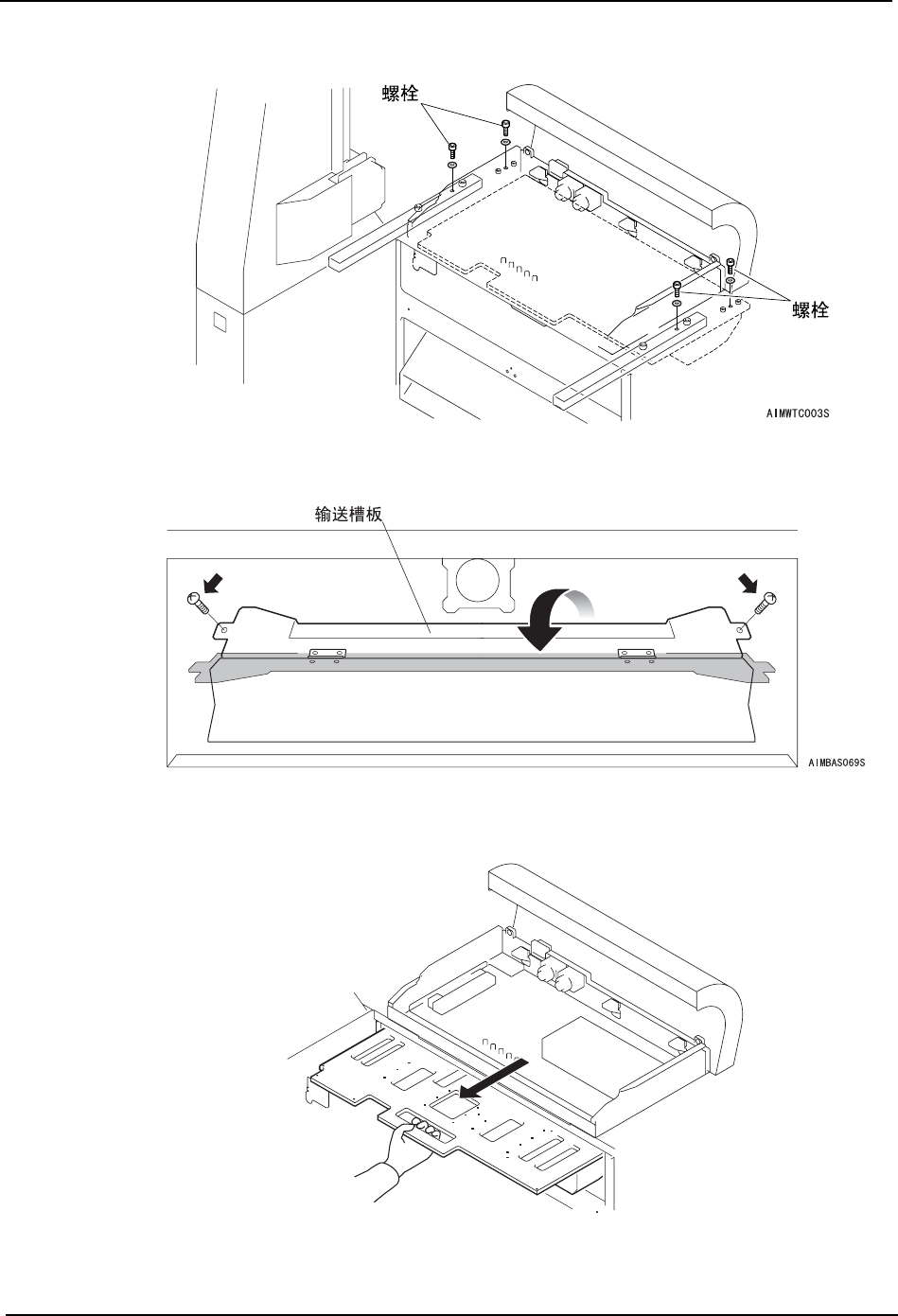 6. 拆除机器下部内的输送槽板的安装螺丝 (2 根),将输送槽板向面前倾倒。