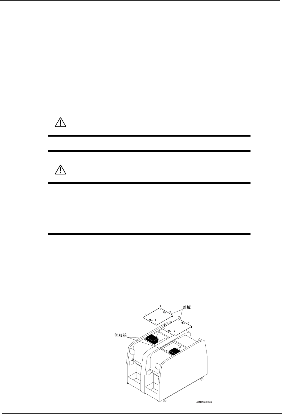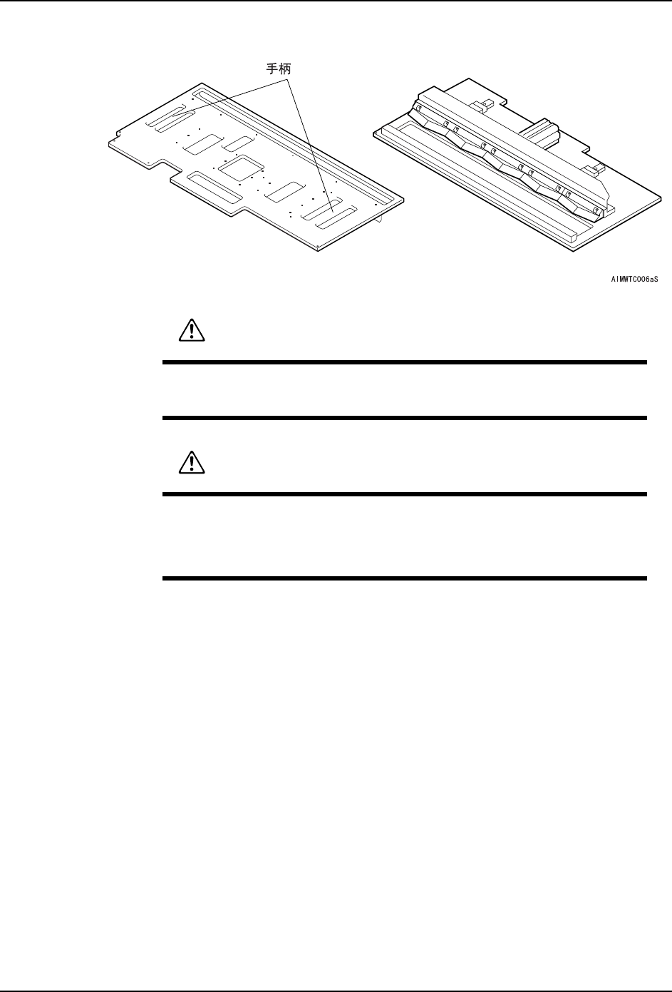 8. 部件的更换 QD053-04 202 AIM 机械手册 8. 抓住单元的手柄,搬运到进行维修保养 操作的操作台上。 9. 结束维修保养后,按与拆除相反的步骤 将单元安装到本机上。 警告 · 输送槽中有阶梯,这个 阶梯在拆下单元时折 叠部份处于自由状态 。非常 危险,在搬运中请不要将手 伸入。 注意 · 单元非常重,请在搬运时充 分注意不要将其落下。 · 操作时,请像上图一样 将输送槽面向上放在 操作台上进行操作 。将输送 槽向下放…