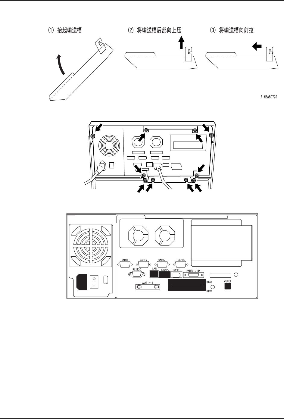 QD053-04 8. 部件的更换 AIM 机械手册 211 8.9 基座 CPU 箱的更换 基座 CPU 箱内存在 A 模组的前侧下部。 8.9.1 必要工具 十字形螺丝刀, 六角扳手 (2.5 ,3,4mm) 。 8.9.2 操作时间 10 分种。( 单侧模 组。) 8.9.3 更换方法 1. 将主电源开关 OFF,切断机器 的电源。 2. 拆下模组 1 前侧的盖板。 警告 在进行更换操作时,请务 必在切断电源后进行。 注意 · 连…