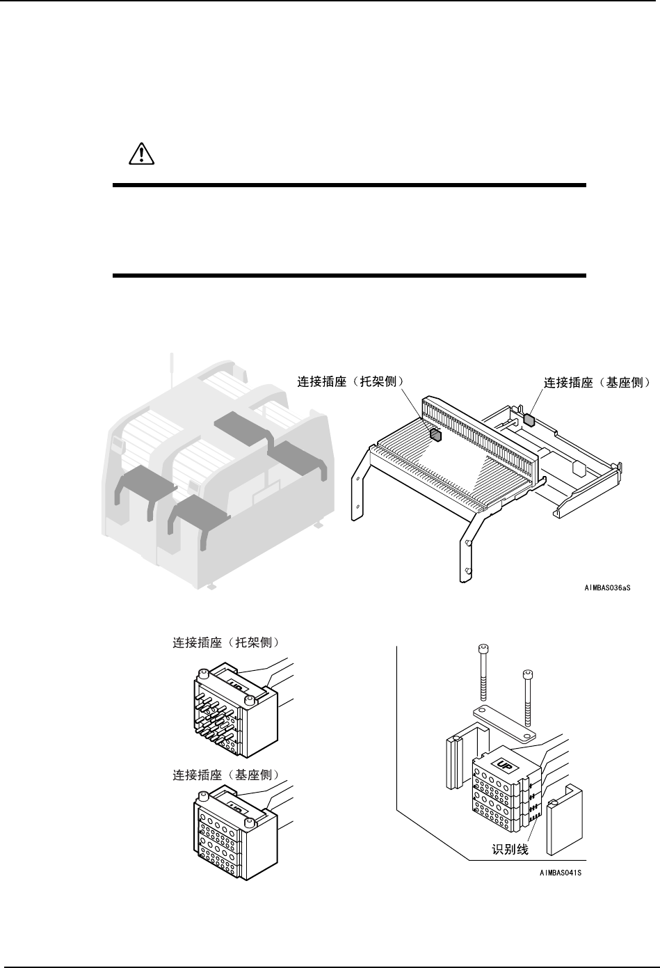 QD053-04 8. 部件的更换 AIM 机械手册 219 8.13 料站托架·基座部份插座的更换 万一分解料站托架·基座部分的 时候,请按照下述要点组装插座。 8.13.1 更换方法 1. 将主电源开关 OFF,切断机器 的电源。 2. 在料站托架和托架基座上的图示位置上有 用于布线的组合插座。 3. 万一产生有必要拆除插座而分解插座后, 在复原时请对齐侧面的识别线装上插 座。 注意 插座的连接以及拆除,请 必须在切断电源后进行。 …
