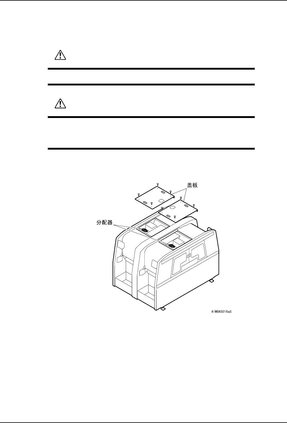 QD053-04 8. 部件的更换 AIM 机械手册 229 6. 拆下螺丝,拆除分配器箱的盖罩。 7. 拆除下图的导线接插头 (4 根) 。拆 除螺丝后取出分配器电路板。 8. 按照与拆除相反的步骤,安装新的分配器 电路板。 9. 连接地线到盖罩上。 10.连接冷却风扇的导 线插座。 11.安装盖罩。