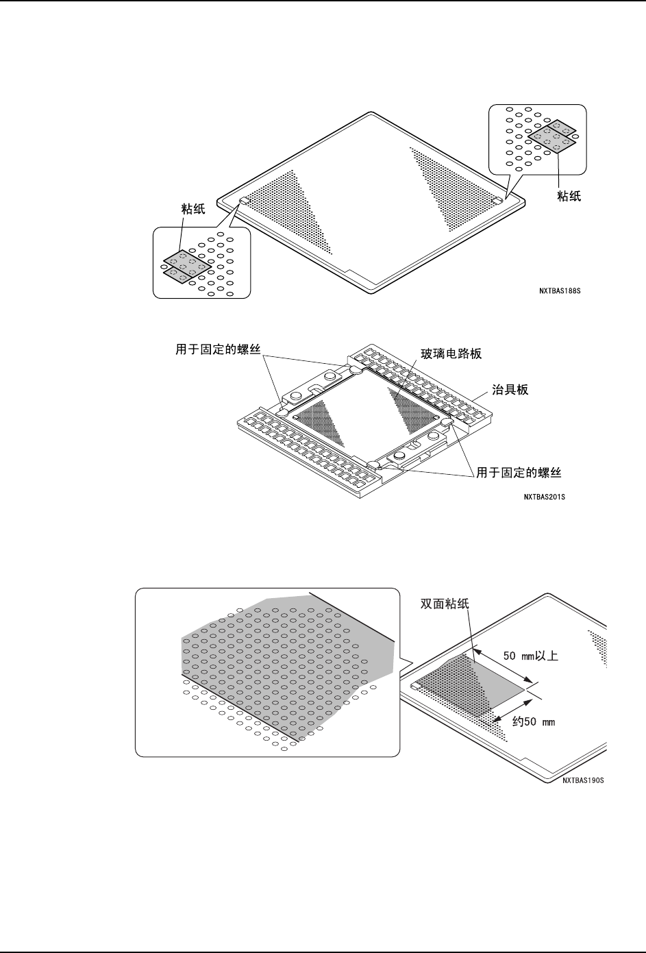 3. 请在玻璃电路板上用双面粘纸 (约 50mm 宽,长 50mm 以上)粘贴。此时,请注意在右上