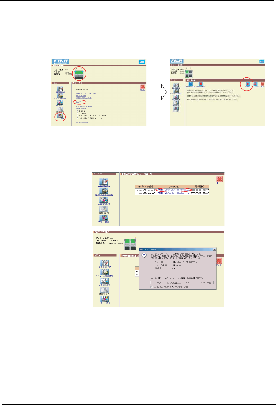 QD053-04 9. 传感器的调整 AIM 机械手册 239 9.1.6 取得测定结果文件 备注 ) 关于在此说明的附加软件的操作方法,请参考 「FUJI 附加软件操作手册」 (在线手册) 。 1. 在机器设定画面上,请确认选择了取得 PAM 测定结果的模组,选择 「远程操作」 。 2. 请选择 「机上 PAM」 。执行 「取得开始」后,开始进行数据的获取。 备注 ) 执行 「开始取得」 后, 从 NXT 机器向服务器传输测定结果数据…