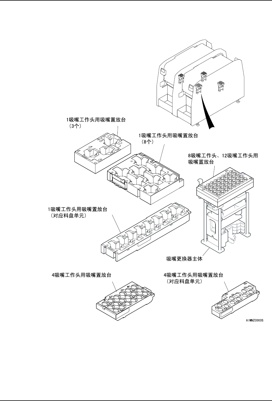 保存装载备用吸嘴的单元。机器自动切换到最合适的吸嘴后进行生产。