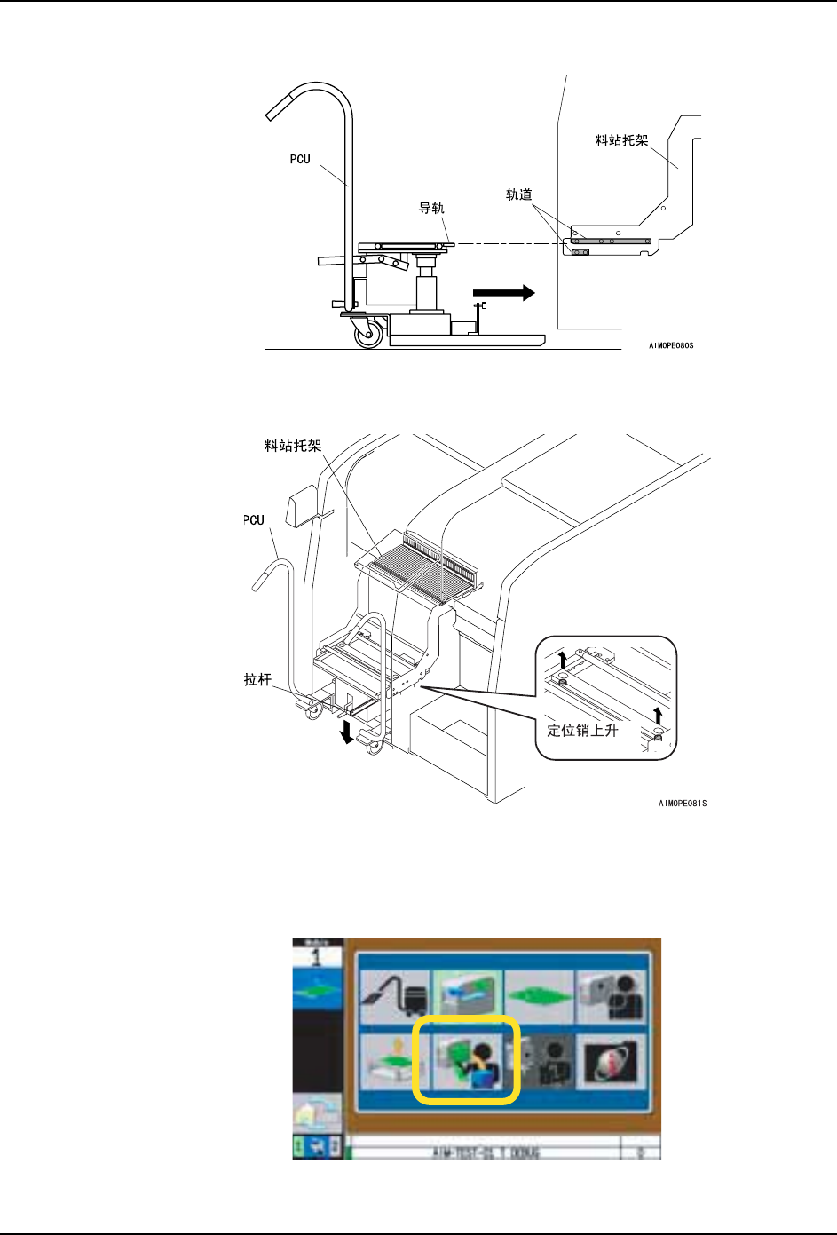 5. 基本操作 QD053-04 56 AIM 机械手册 4. 将 PCU 的导轨插入到轨道 中,将 PCU 紧 紧地压入直到碰到阻停块为止。 5. 按下 「MANUAL 」按钮,显示出手动指令。 注意 ) PCU 如果不紧紧地压入模组内就不能进行手柄的操作。 6. 用手动操作指令,将料站托架从机器上 松开。 a. 按 下 「MANUAL」按钮 。 b. 按下箭头键,选择更换单元示意图,按下 「OK」按钮。 02SYS-0163