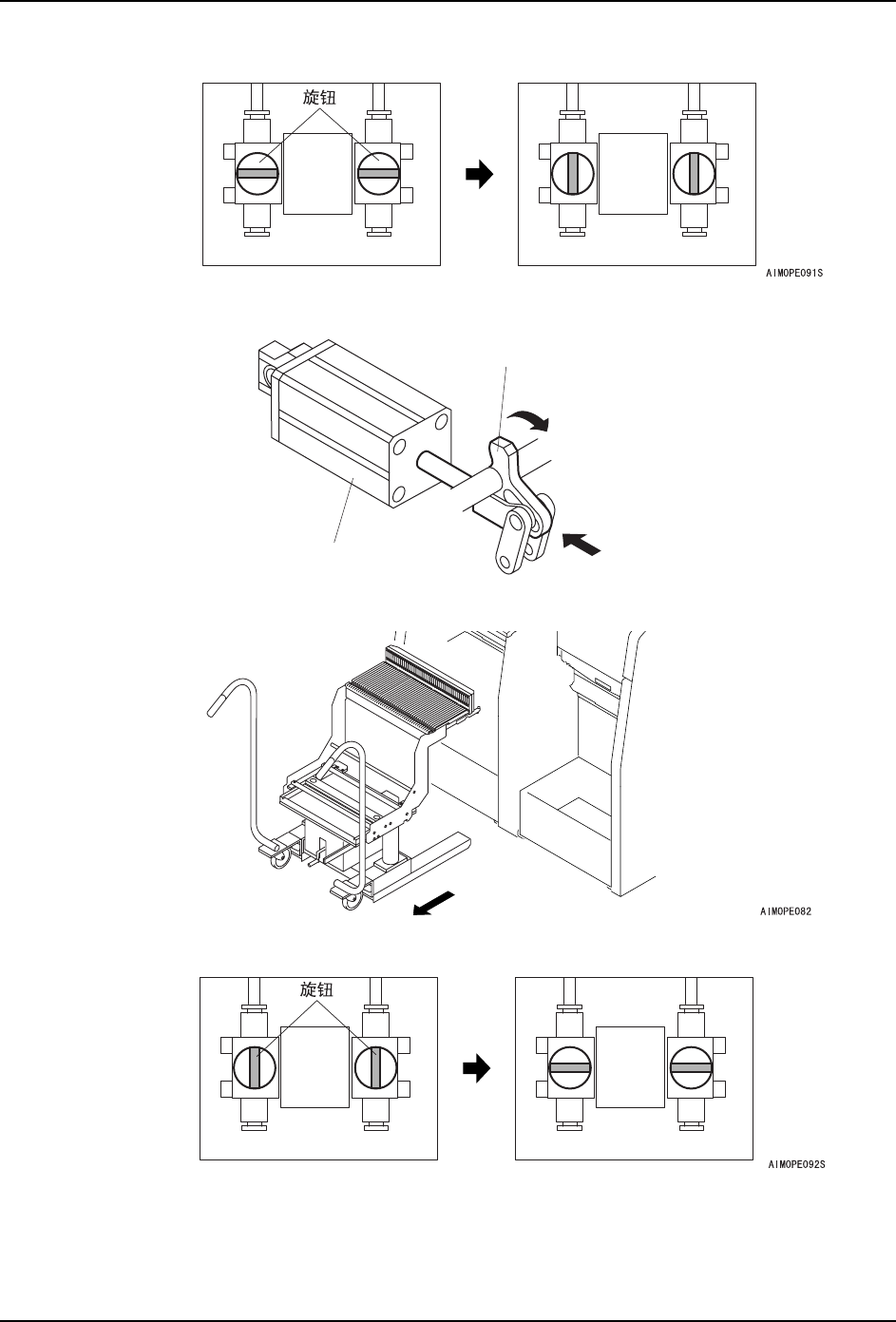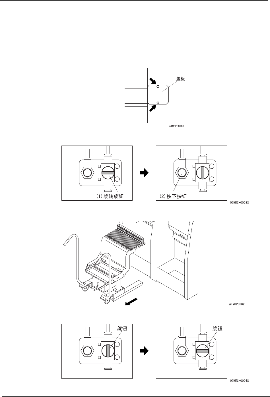 5. 基本操作 QD053-04 60 AIM 机械手册 4 . 将 空 气 阀 的 旋 钮( 2处)各 自 旋 转 后 放 掉 空 气 。 5. 用手指压入料站基座内的夹紧汽缸,解 除夹紧手柄。 6. 慢慢地拉 PCU,将 PC U 从机器 ( 模组 ) 上拉出。 7. 将空气阀返回到各自的位置上,安装盖 板。 8. 安装料站托架下侧的盖板。 0(&6 །㋻ᶘ །㋻≑㔌 ᣝय़ℸ໘