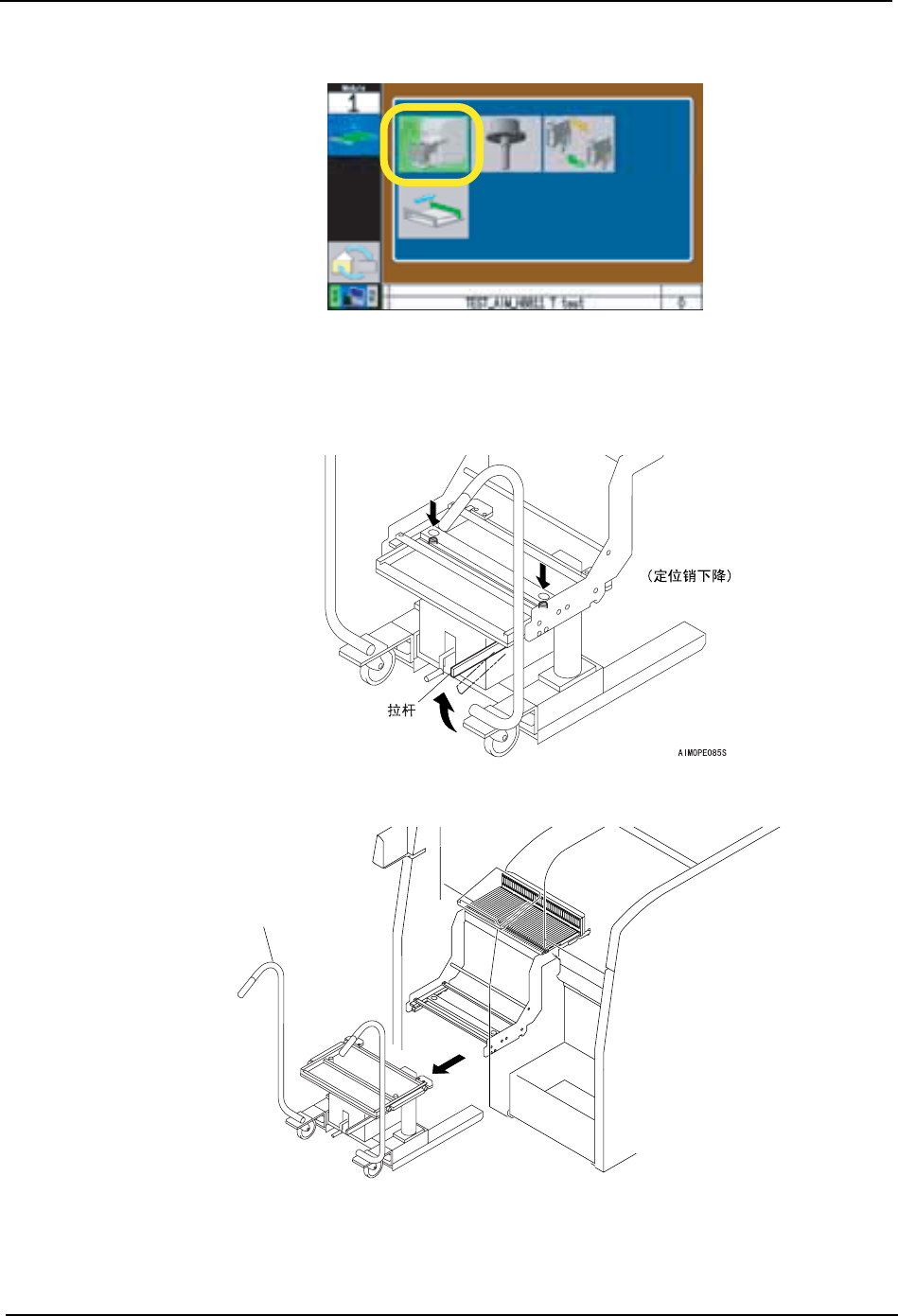 QD053-04 5. 基本操作 AIM 机械手册 65 c. 按下箭头键,选择更换托架指令。 d. 按下 「OK」按钮。 9. 将 PCU 的拉杆抬起,松开料 盘托架。 注意 ) PCU 如果不紧紧地压入模组内就不能进行手柄的操作。 10.慢慢地拉出 P CU,将其从料站托架上脱离 。 11.锁定脚轮使 P CU 不要随意移动。 12.将废料带箱安装到 机器上。 02SYS-0157 AIMOPE086a PCU