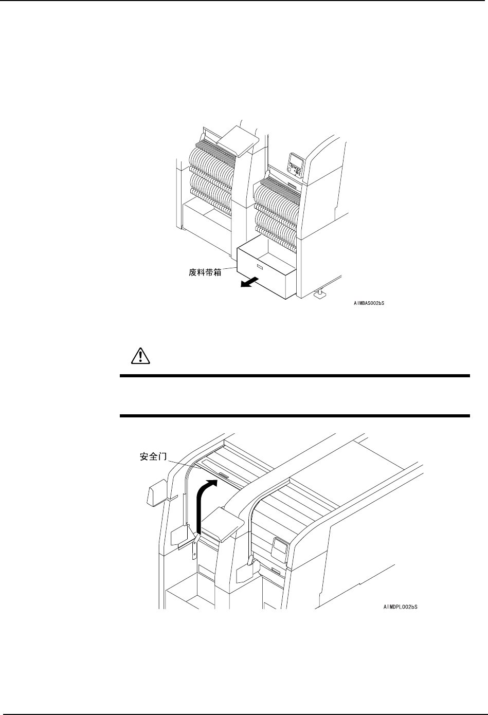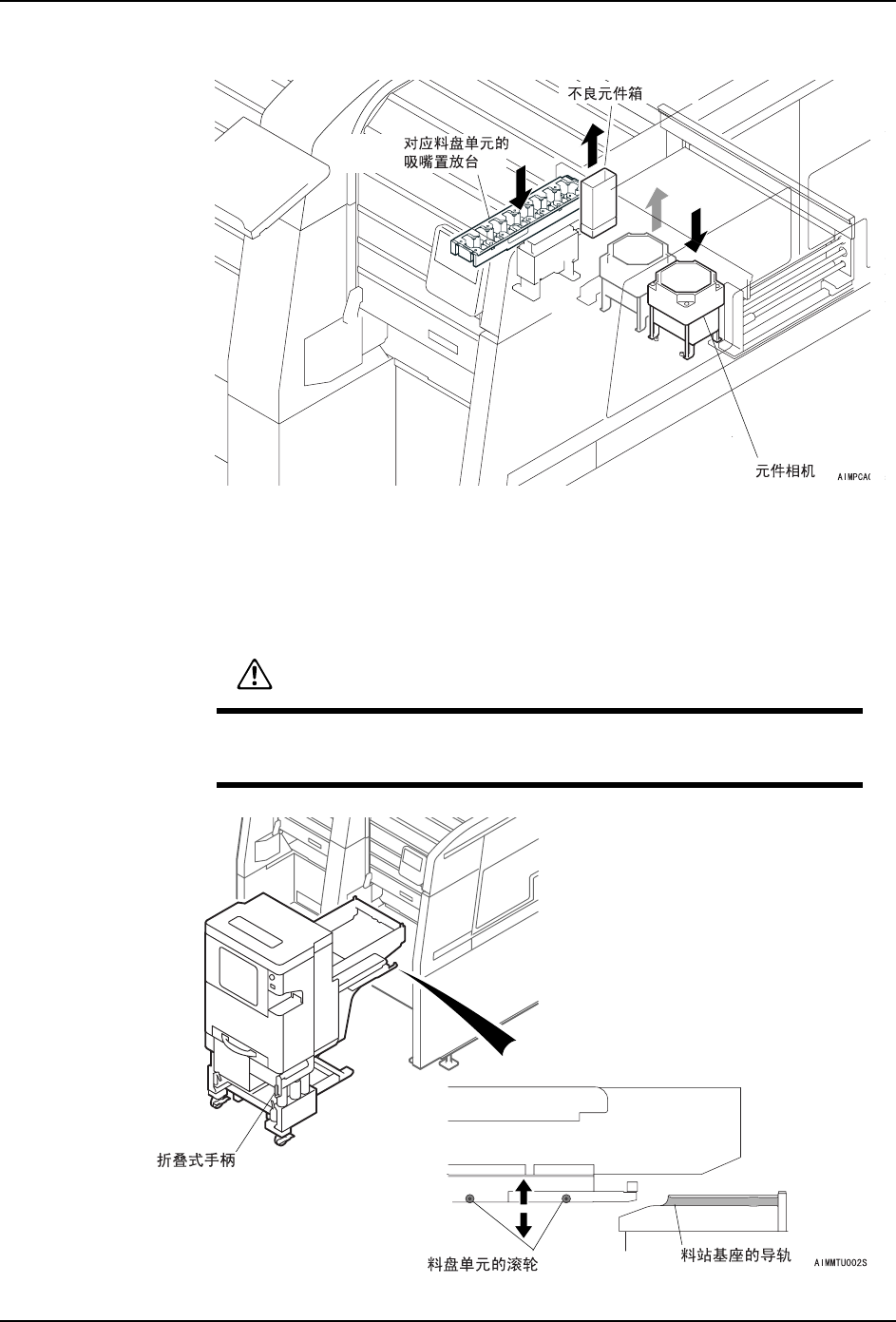 5. 基本操作 QD053-04 70 AIM 机械手册 6. 拆除废料带输送槽。( 拆除方法的 详细内容请参考 「5.5 .3 废料带输送槽和盖罩」 ) 安装料盘单元 -L 1. 将料盘单元 -L 面向机器 ( 模组 ) 布置。 2. 将料盘单元 -L 的 滚轮与料站基座的导轨对齐。紧紧地 压入料盘单元 -L 直到碰到机器内 的阻停块为止。料盘单元 - L 自动地锁定在机器上。 警告 在将料盘单元压入机器时, 请确认料盘单元盒基座之间…