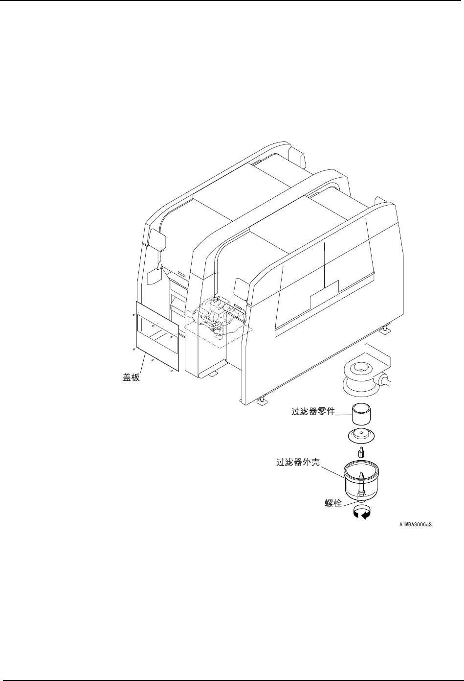 QD053-04 6. 预防保养 AIM 机械手册 119 6.8.2 真空泵过滤器的清扫 1. 将真空管道内设定为大气压。 2. 从本体上拆除盖板。 3. 拧松螺栓,拆下过滤器外壳。 4. 用中性洗涤剂洗涤过滤器外壳。 5. 使用压缩空气吹气清扫滤器外壳,污垢严 重时,请与新品更换。 Side 2