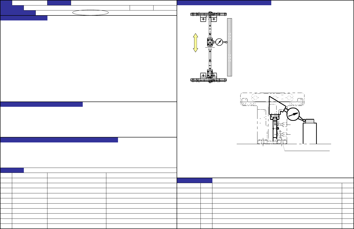 QA表 NO. 1/ 2 机种 传送导轨移动用直线导向器的平值·平行(1/2) 1. 单体上的直线导向器的平直度 1-1. 确认方法 ① 设置放置I型样板平尺的夹具。(往高处抬) 单体上的直线导向器的平直度: 20μm以下 ② 设置千分尺,在两端设置I型样板平尺使千分尺的值为“0”。 左右的直线导向器的平行度: 20μm以下(仅在两端部) ③ 在直线导向器的座上设置千分尺, 确认在整个行程中平直度是否都是在20μm以内。 1-2. 调整…