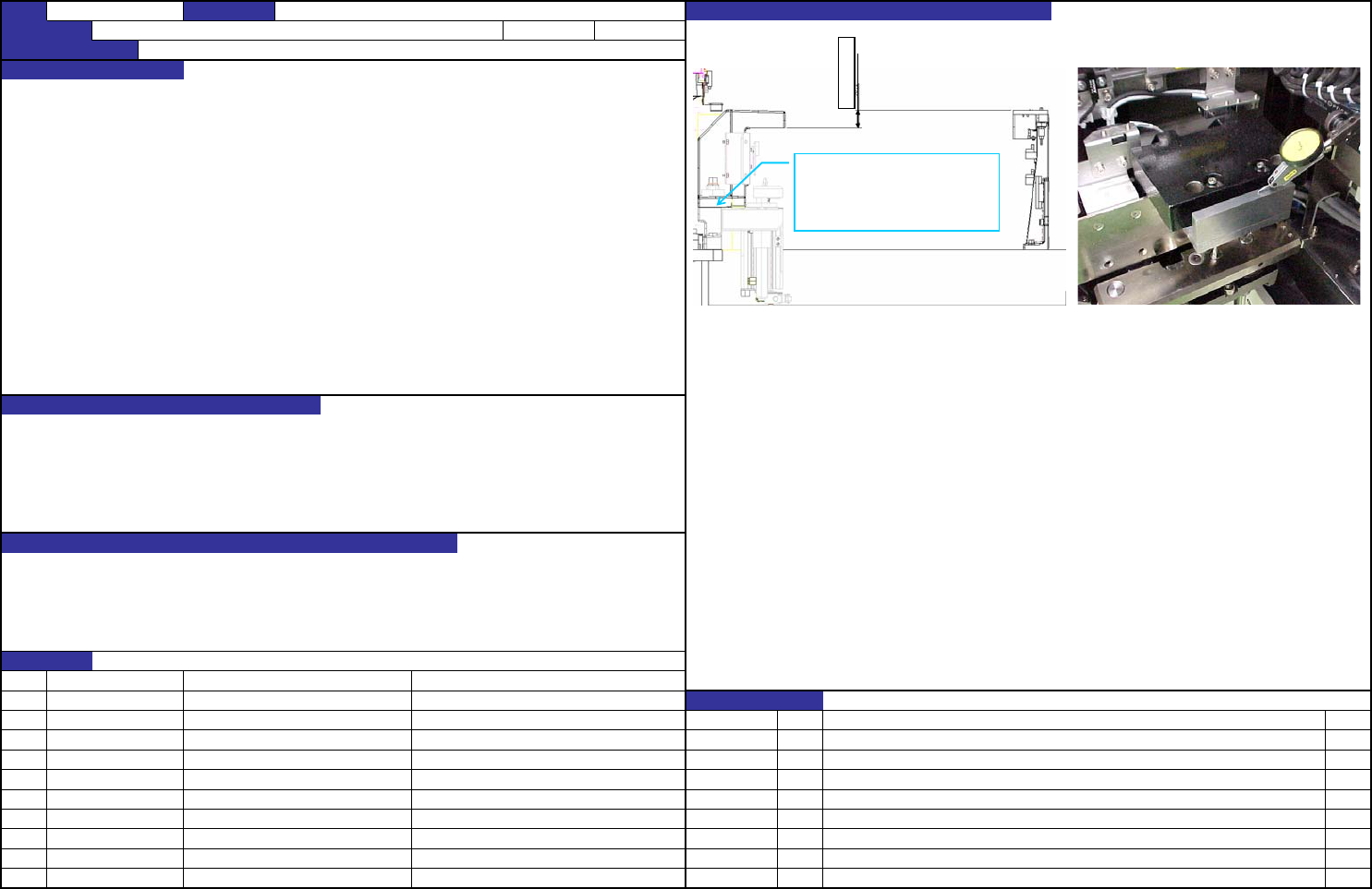 QA表 NO. 2/ 2 机种 NO ① ② NO. 担当人 ③ ④ ⑤ ⑥ ⑦ ⑧ ⑨ ⑩ 【8】-4 FX-3R 装置名称 供料装置 确认方法及调整方法(故障处理方法) 功能名称 供料器架高度调整2 质量保证类别 功能 ・ 安全性 / 可靠性 / 安全性 / 商品特点 质量特性(规格调整值) 功能作用(规格调整值的意义) 预想故障(应规格调整值不良而发生的故障) 对象元件 变更履历 货号 品名 有关质量特性 内容 日期 供料器安装面…