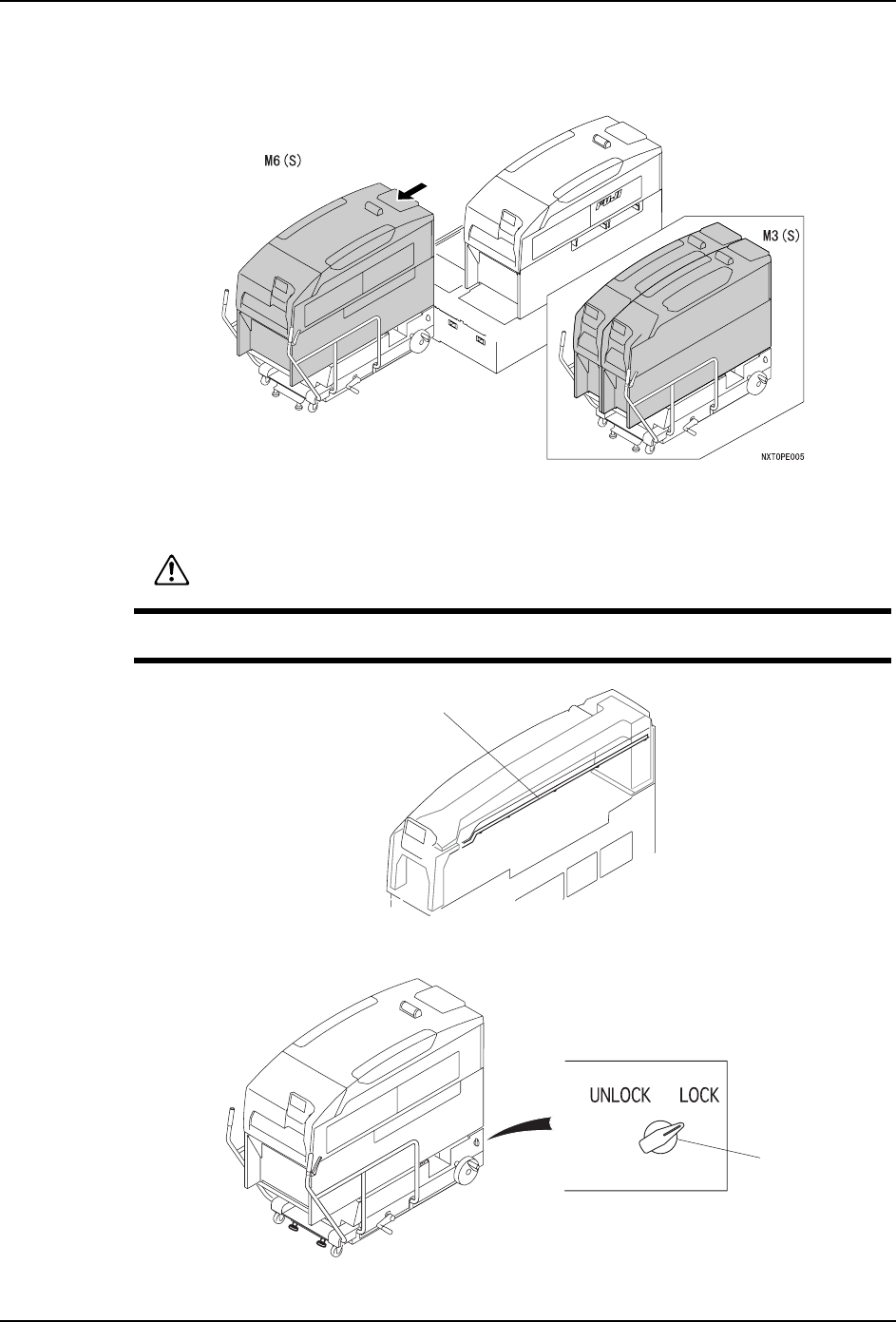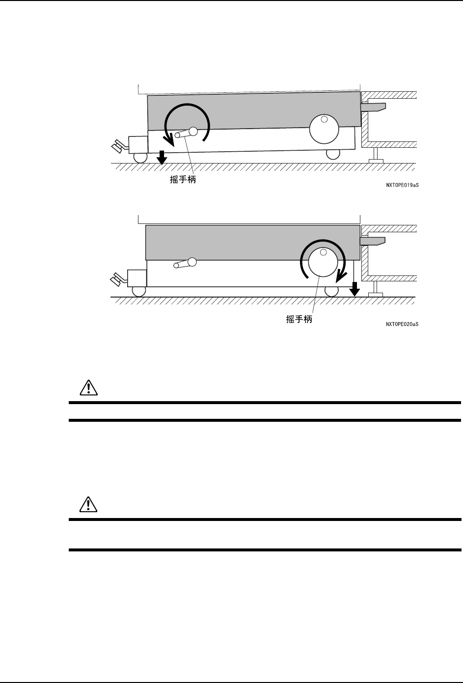 QD029-26 5. 基本操作 NXT 机械手册 89 7. 降下 MCU 的后轮 ( 仅仅限于用步骤 (3) 调整水平的时候 ) 备注 )以步骤 (3) 进行 MCU 的水平调整时, 请用以下的步骤降低 MCU 的后轮。 不进行调整时, 按原样拉出 MCU。 a. 旋转摇手柄,降低后轮 ( 提升升降脚 ) b. 同样,前轮也下降。 8. 从基座上将装载模组的 MCU 卸下。 a. 从基座侧拉出电缆链套、从模组中小心地 拉出。 b. …