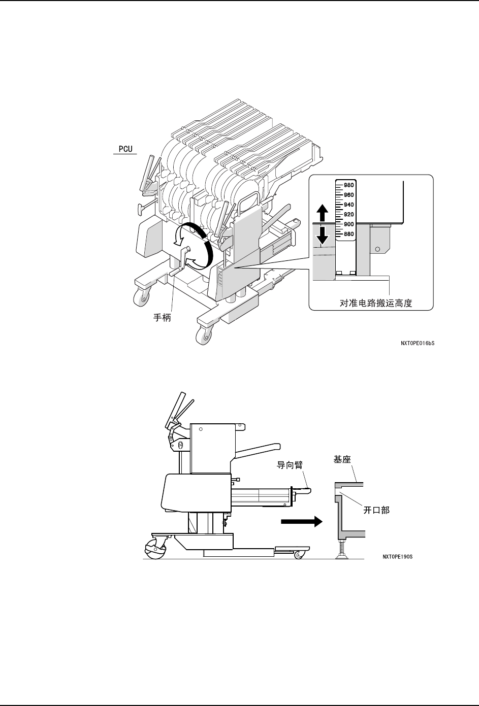 导向臂的高度一边推入 PCU。当高度不一致时,请旋转手柄进行微调整后插入。