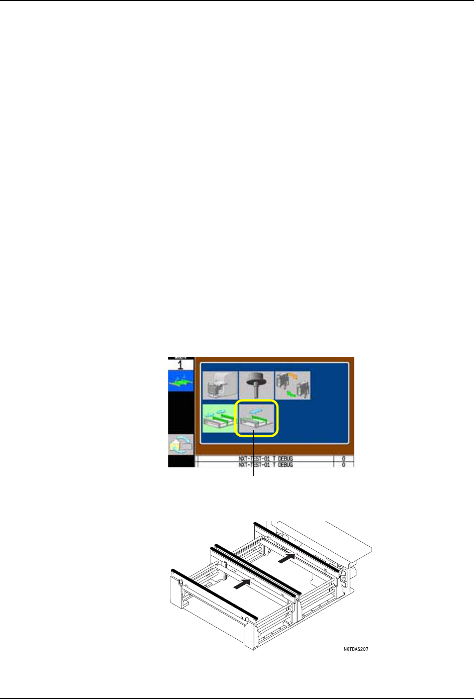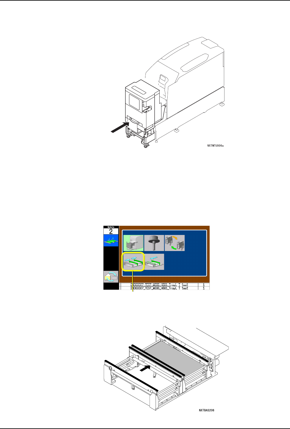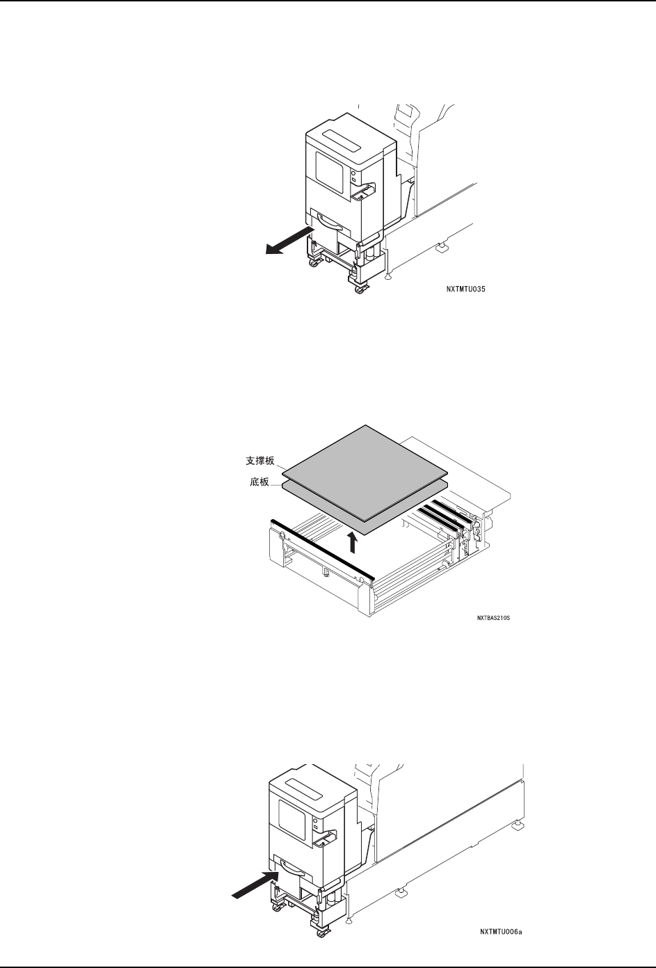 QD029-26 5. 基本操作 NXT 机械手册 147 5. 请 按下 OK 按键。 6. 请拆除料盘单元 - L,解除脚轮的锁定,从模组中 慢慢地拉出料盘单元 -L/LT。卸下结束 后,在操作画面上显示出拉出模 组向导。 7. 请拉出模组。 a. 请确认模组前侧是否有障碍物后按下 OK 键。 锁定松开, 模组自动地向前方移动一些。 b. 握住模组的手柄,直到碰到阻停块为止慢 慢地向己方拉出。 8. 在操作面板上显示出拆下支撑板的向…