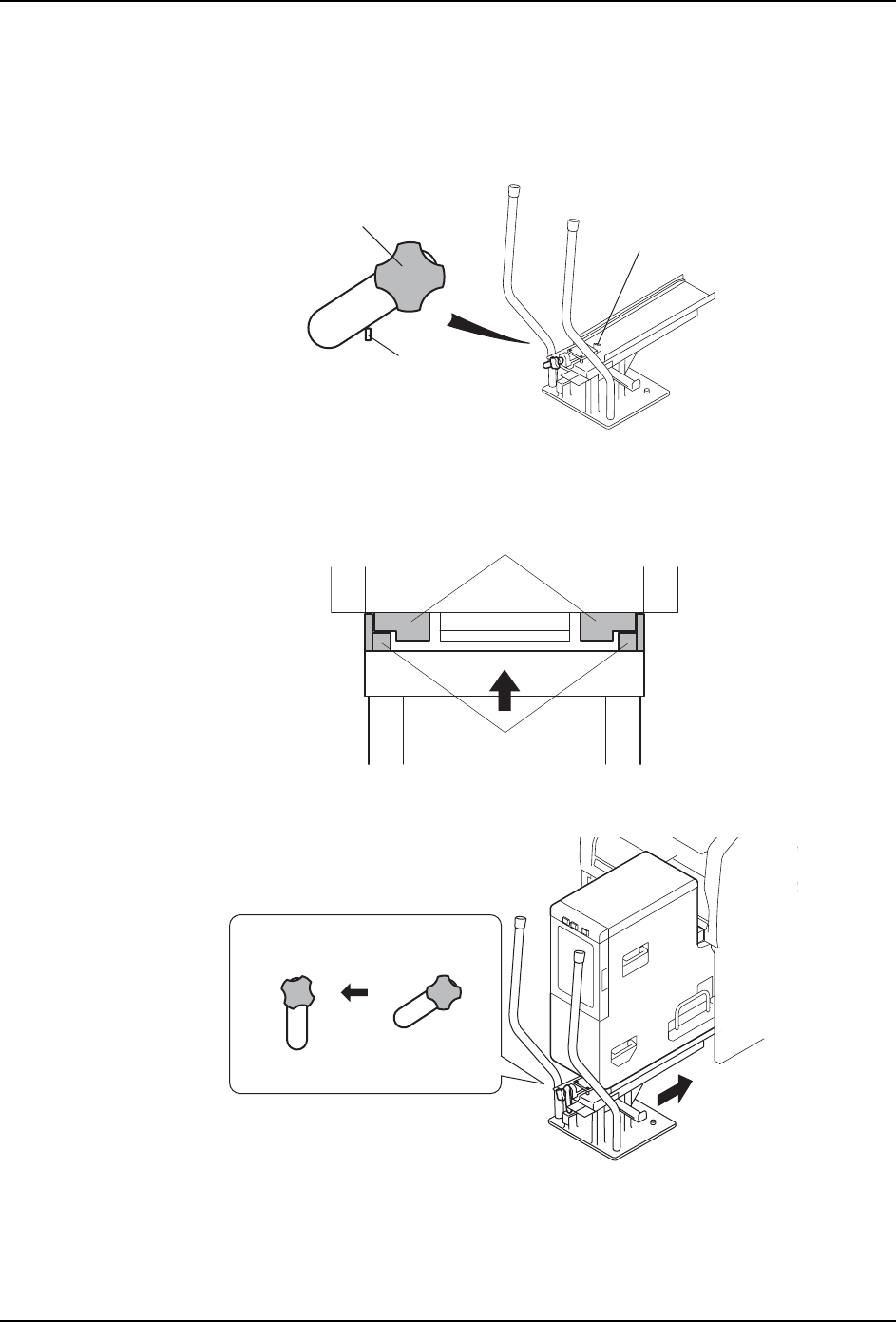 5. 基本操作 QD029-26 166 NXT 机械手册 5.10.5 拆除方法 (使用更换台车) 1. 拉 出模组。( 参考 " 5.1 模组的 拉出 / 插入 "。) 2. 拉出空的更换台车的锁定手柄 (红色)旋转,如下图挂在挂钩上。 ( 此时台车上面的锁 定销处于自由状态。) 3. 将空的台车配置在料盘单元 -M 下侧。 4. 转动摇柄调整台车的高度,使台车的轨道 上面与料盘单元 -M 的底部接触。 5. 把…