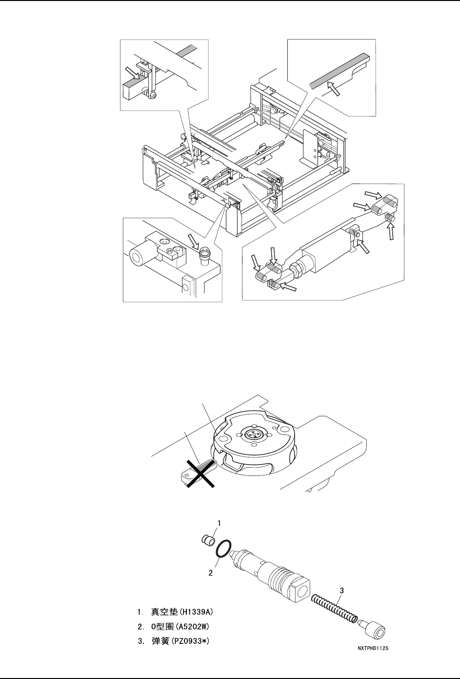 6. 预防保养 QD029-26 216 NXT 机械手册 〈单搬运轨道〉 13.安装备份板。 14.插入模组。 ( 参考 " 5.1 模组的 拉出 / 插入 ") 6.7.5 H01 工作头内空心轴 Assy 的清扫 〈仅限于不搭载法兰盘过滤器时〉 在法兰盘部装备 有过滤器的时候, 不必清扫空心轴 Assy。 在清扫时,为了防止在操作中丢 失以下部件,推荐对以下部件各自 准备 2 个。 0(&…
