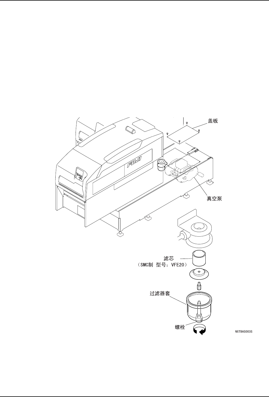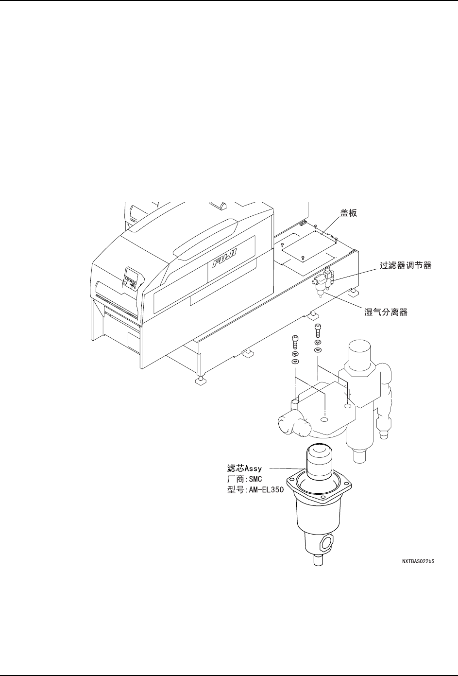 QD029-26 6. 预防保养 NXT 机械手册 225 6.9 每 12000 小时的操作 请进行以下的加油。 6.9.1 湿气分离器的清扫 1. 拉 出模组。 (参考 " 5. 1 模组的拉出 / 插入 ") 2. 请将主电源开关 OFF。 3. 取下基座上的盖板。 4. 关闭气源接入处的外部气源,此时配管 内气压降低。 5. 拧松安装螺栓,拆下滤芯 Assy。 6. 使用压缩空气吹气清扫滤芯,污垢严重 时,请…