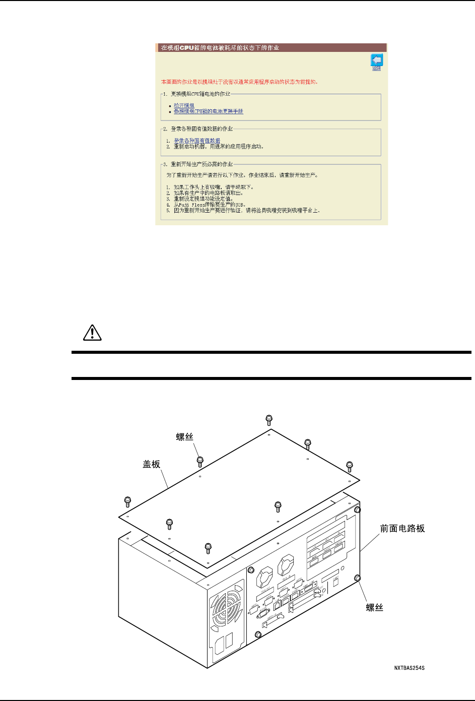 8. 电池更换后,按照与拆除相反的顺序安装 CPU 箱并将其安装到模组上。