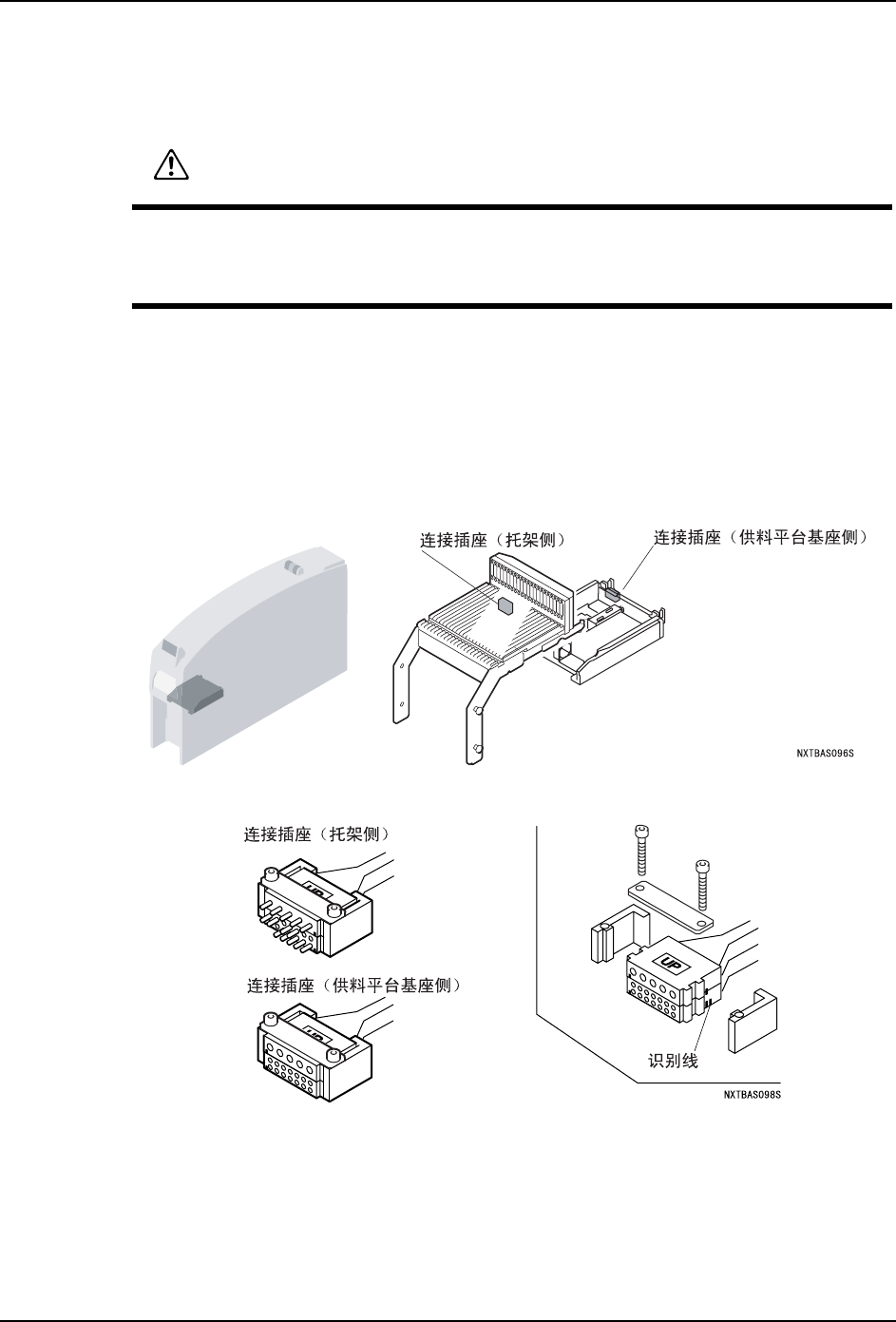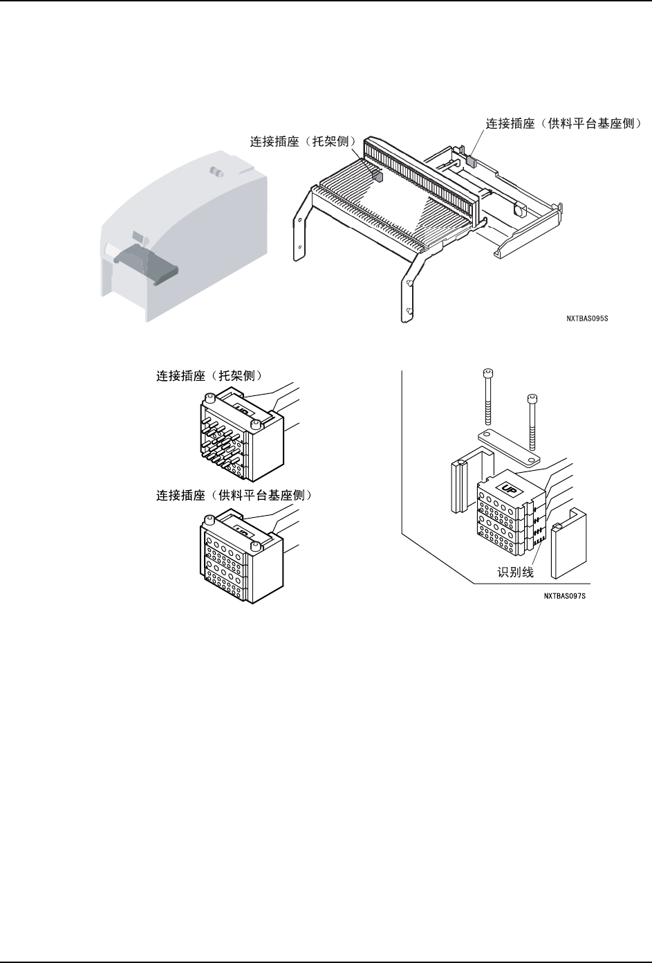 QD029-26 8. 部件的更换 NXT 机械手册 397 8.16.3 M6(S) 模组的时候 1. 将 主电源开关 OFF。 2. 在托架和托架基座上的图示位置上有用 于布线的组合插座。 3. 万一产生有必要拆除插座而分解插座后 ,在复原时请对齐侧面的识别线装上 插座。