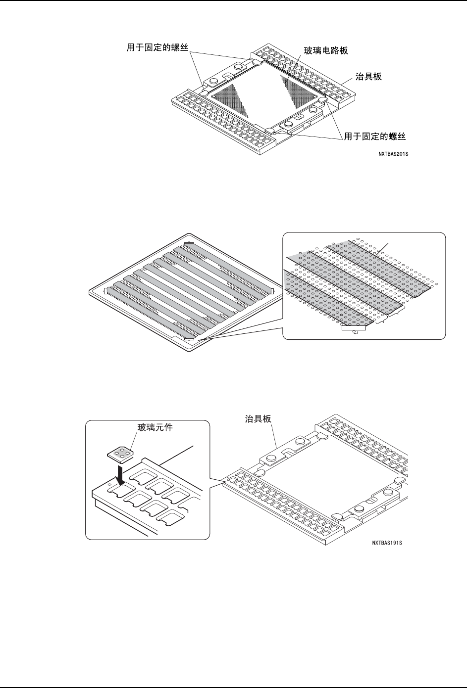 2. 请将玻璃电路板的定位点印刷面向上安装在治具板上用 4 个螺丝固定。