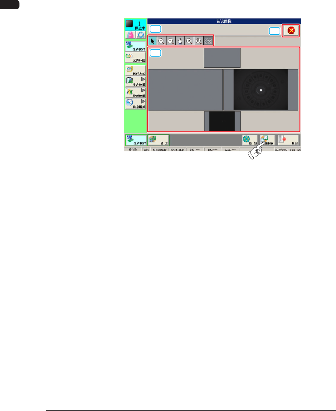1OM-1604 2-1 1 第二章2.操作界面 [2] 显示图像操作按钮 用以下按钮切换对 “ [1] 识别图像显示领域 ” 中显示的图像进行放大或 移动等操作的模式。 [ ]按钮 : 通常操作模式 [ ] 按钮 : 图像放大模式 按下 [ ] 按钮移行到图像放大模式后 ( 指针 形状变为 记号。),触摸想要放大的图像或 在图像上点击鼠标的左按钮,图像便以指针位 置为中心被放大。 想要固定位置而放大时,请将指针对准图像的 中…