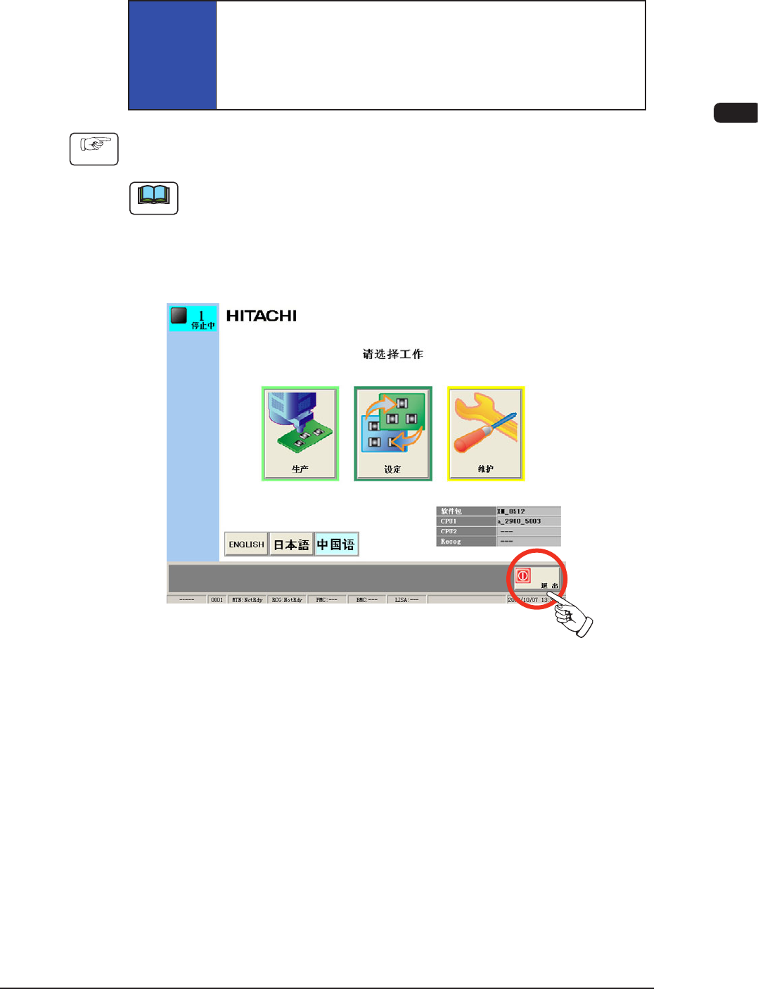 1OM-1604 2-16 第二章4.结束 4. 结束 4.1 退出登录 结束操作界面时,按通用菜单栏的 [ 返回 ] 按钮。 结束操作界面返回到初始界面。 显示有 “ 线路板程序 ” 编辑界面等各种编辑界面时,在按 [ 返回 ] 按钮之 前,请根据相应操作步骤结束各种编辑界面。 F1B9 101 1-002 Note