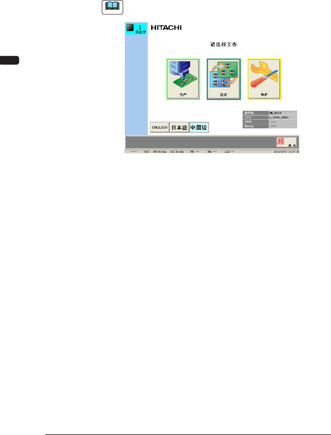 自检测一结束,[POWER ON] 按钮变为黄绿色,在触摸屏上显示初始界面。