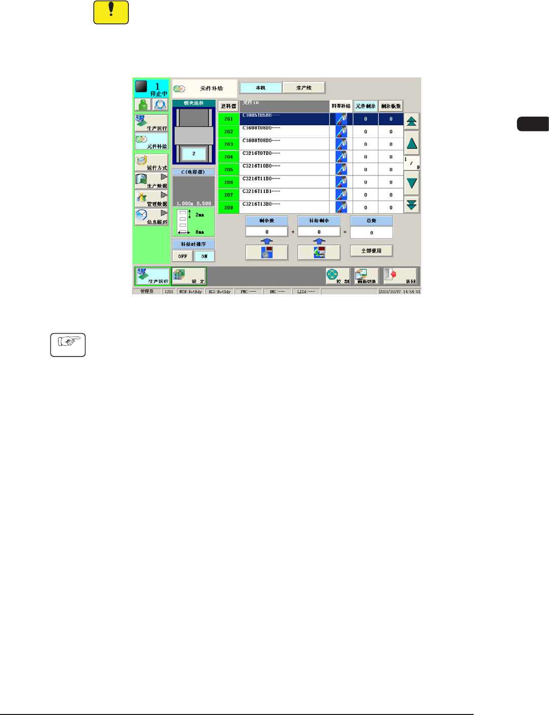 (2) 在生产运行主界面,按 [ 元件补给 ] 按钮,切换到