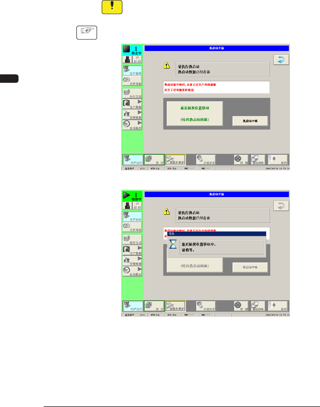 中断生产运行时,显示热启动界面。