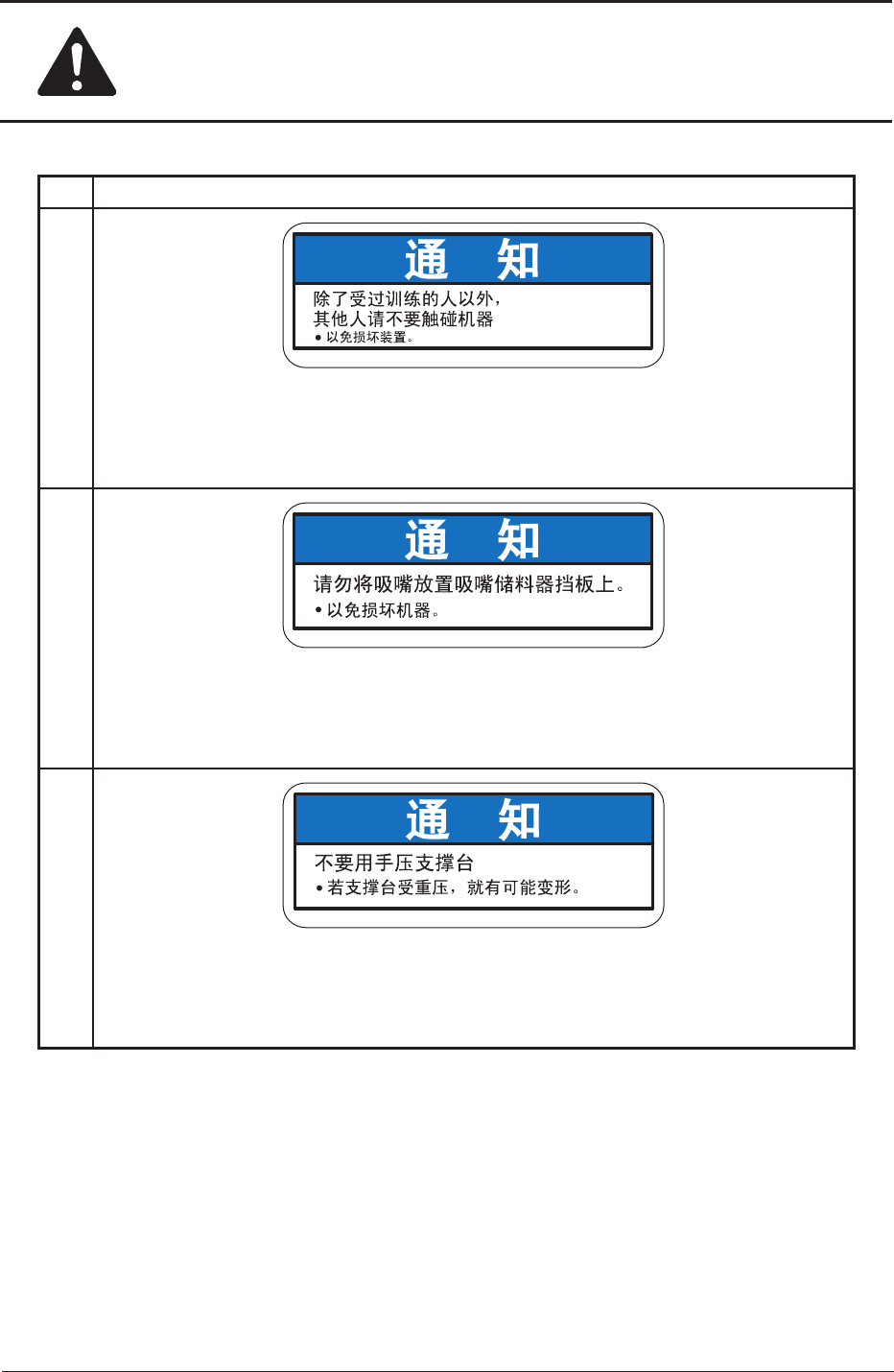 安全 -28 1OM-1604 101 1-002 4.本装置的警告标签 No. 警告标签及其说明 (17) 1 1-0252- 说明 除了装置运行操作人员或受过训练的人以外,其他人请不要触碰机器。 以免损坏装置。 (18) 1 1-0272- 说明 请正确安装吸嘴到吸嘴储料器上。 若将吸嘴放置到吸嘴储料器挡板上进行运转,就有可能损坏机器。 (19) 1 1-0273- 说明 在装置内部进行作业时,若用手压支撑…