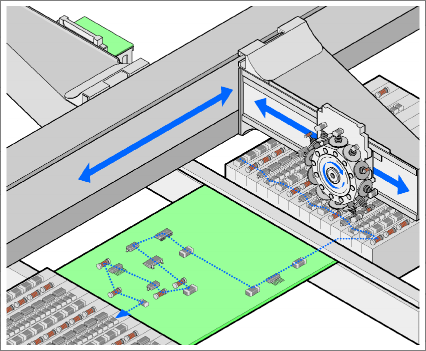 from the trays in the matrix tray changer, and place the PCBs, which are also stationary. The