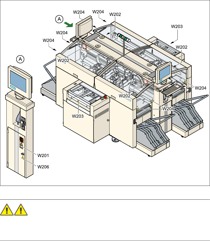 2.2.1 贴片机上的警告标签 W201、 W203、 W204