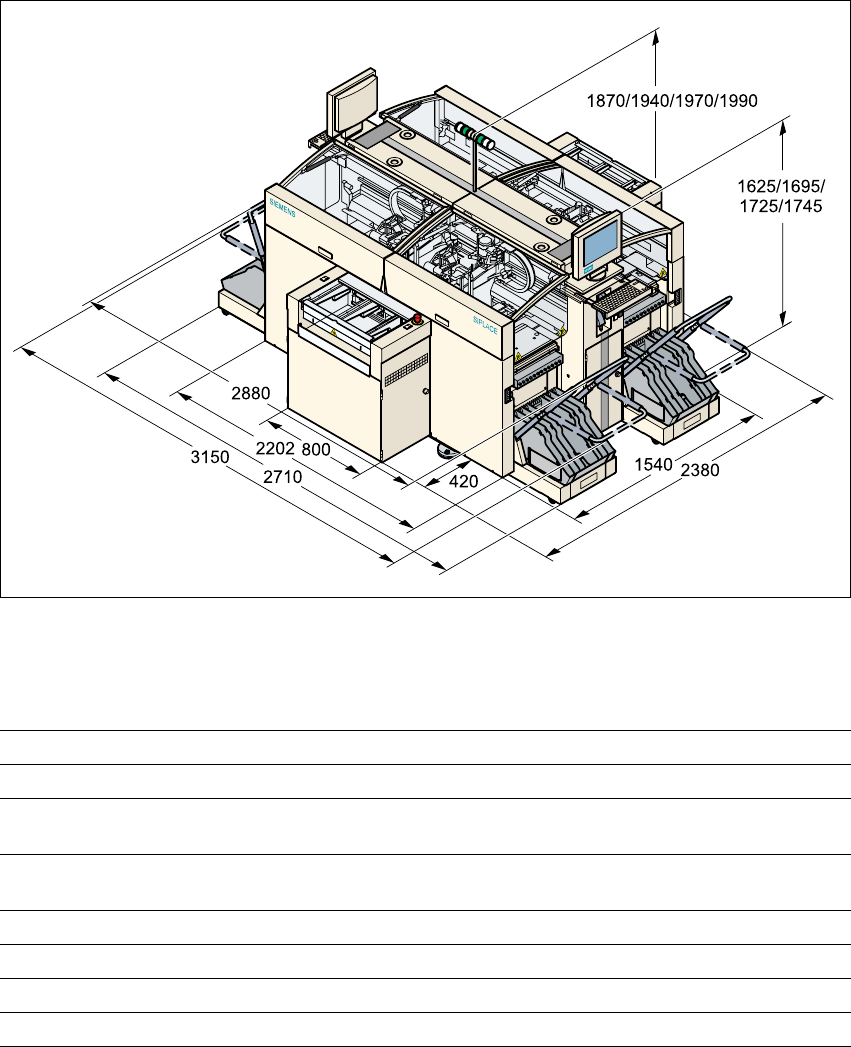 3 技术数据 用户手册 SIPLAC E HS-60 3.5 贴片系统的尺寸和重量 软件版本 SR.503.xx 2003 年 3 月中文版 76 3.5 贴片系统的尺寸和重量 3.5.1 贴片系统的尺寸 3 图 3.5 - 1 贴片系统的尺寸,用毫 米表示 3.5.2 技术数据 - 尺寸,重量 3 长度 2385 mm (包括传送带) 宽度 3150 mm (包括支座) 带警示灯的高度 1,870 mm ,标准高度 1940/1970…