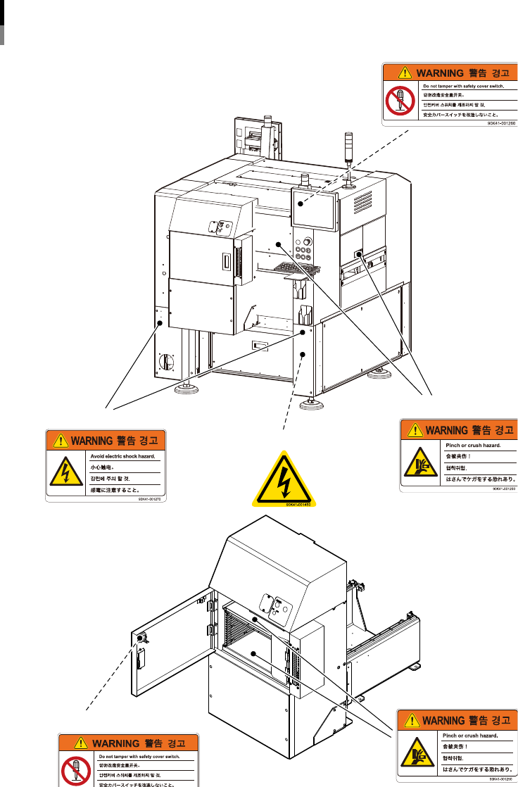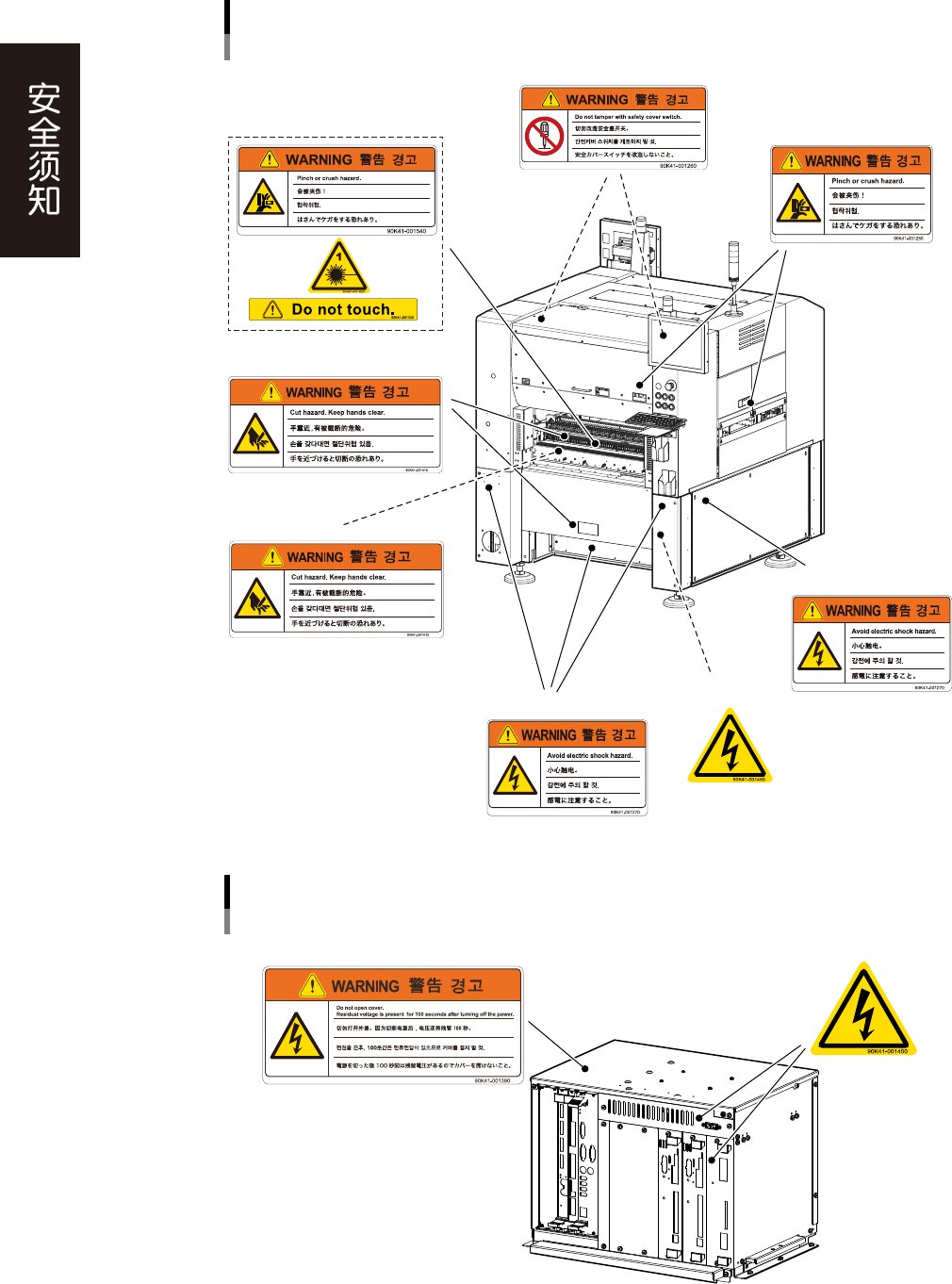xxx ■ 标贴张贴位置 警告标贴 YS12F背面 ■ 机盖内部 ■ 机盖、传送轨开口部 ■ 下部盖板 ■ 盖板内部 ■ 侧面 ■ 切带机部 ■ 送料器安装部 ■ 切带机内部 95202-L7-20 警告标贴 控制箱部 ■ 控制箱顶面 ■ 控制箱正面盖板部 95203-L6-20
